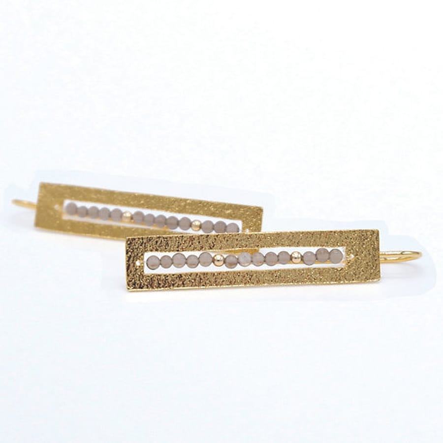 A line between heaven and earth. - .950 sterling silver - 22k Micron-plated - Available in Natural Smoky Quartz Topaz or Garnet - 1.5in long - 0.2in wide