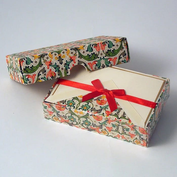 Classic, cream-colored cotton folding note with a metallic gold edge. Envelopes are lined with traditional Florentine pattern. Matching re-useable Florentine pattern box. Packaged with single red ribbon.