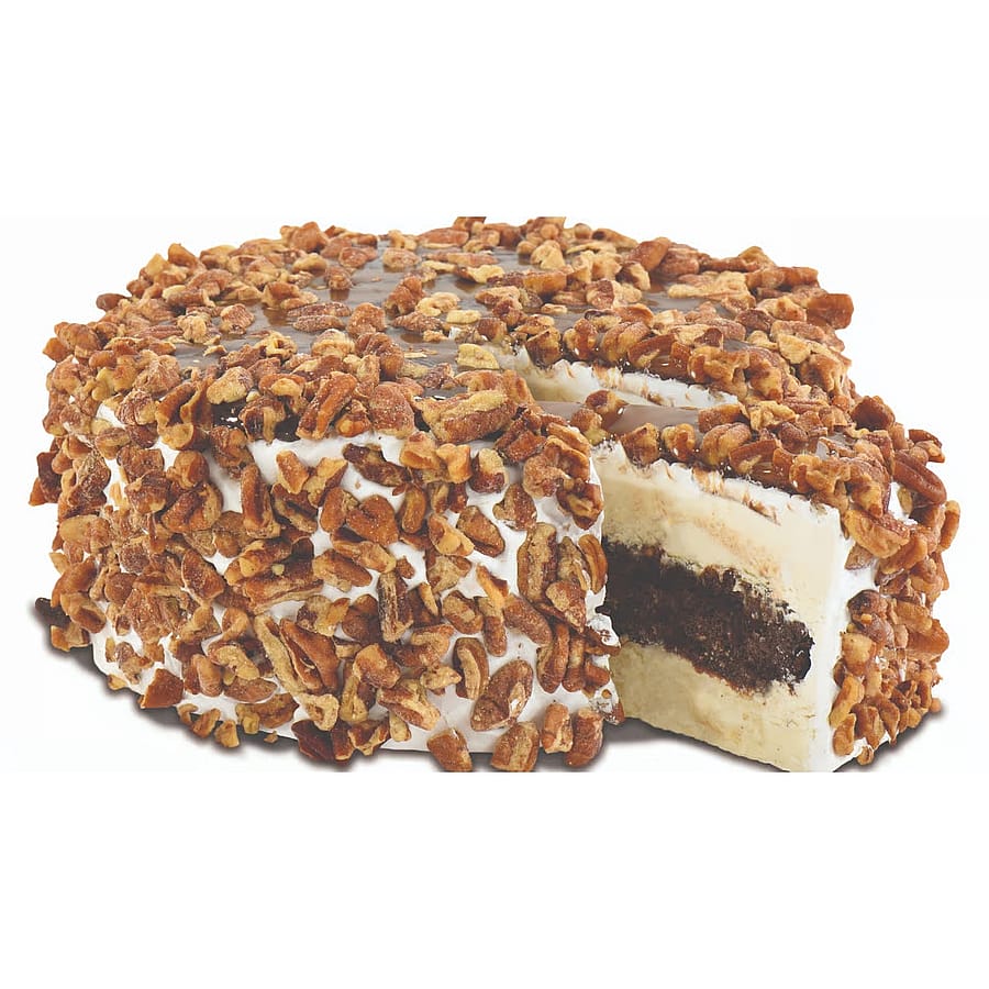 Layers of rich chocolate, creamy vanilla, and caramel, topped with crunchy pecans.