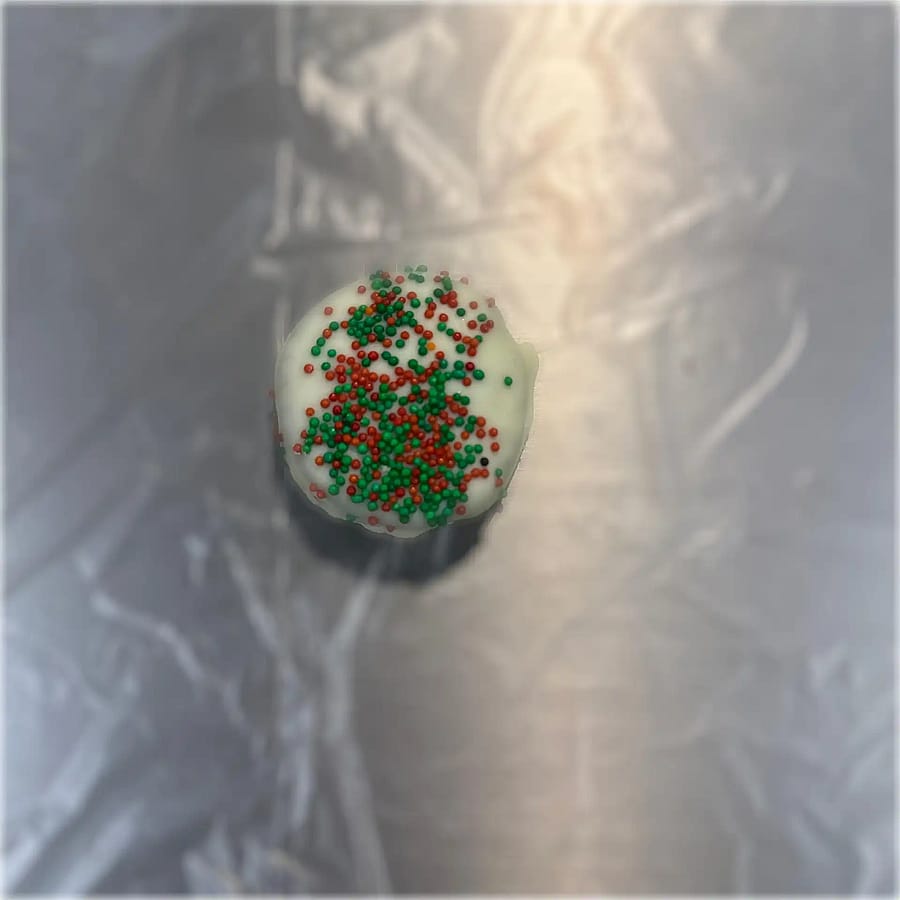 Oreo cookie enveloped in smooth white chocolate, typically sprinkled with decorative toppings.