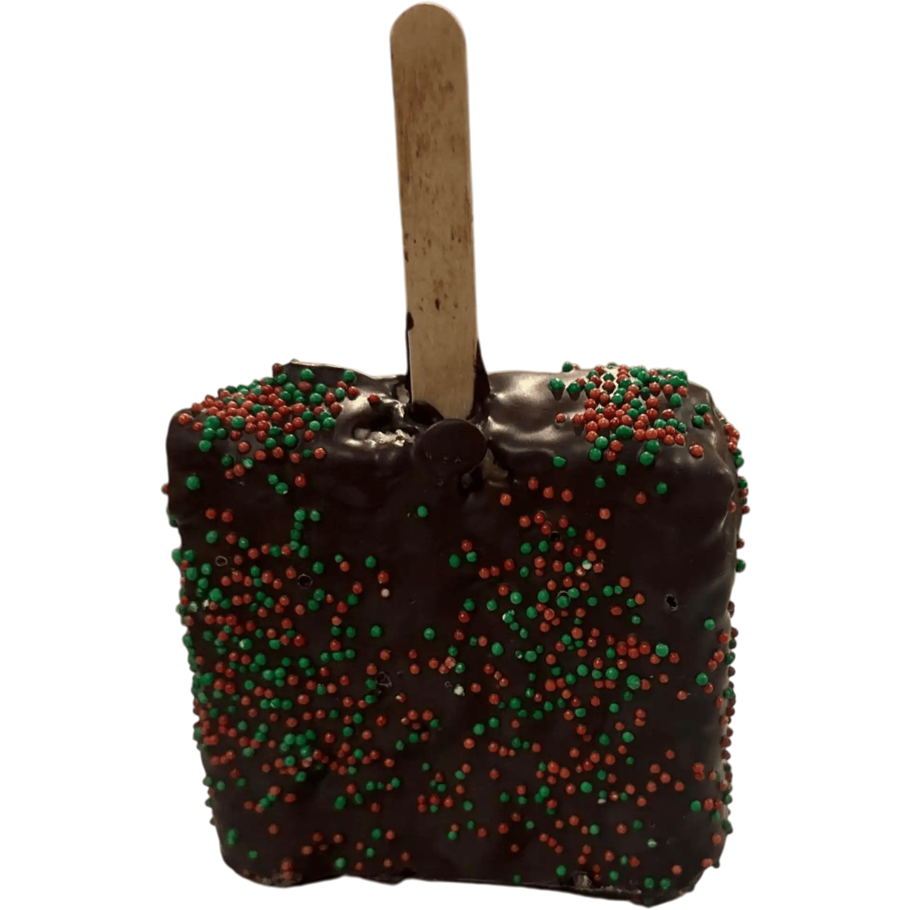 Coated in milk chocolate and adorned with colorful candy pieces, this crispy treat offers a delightful crunch.