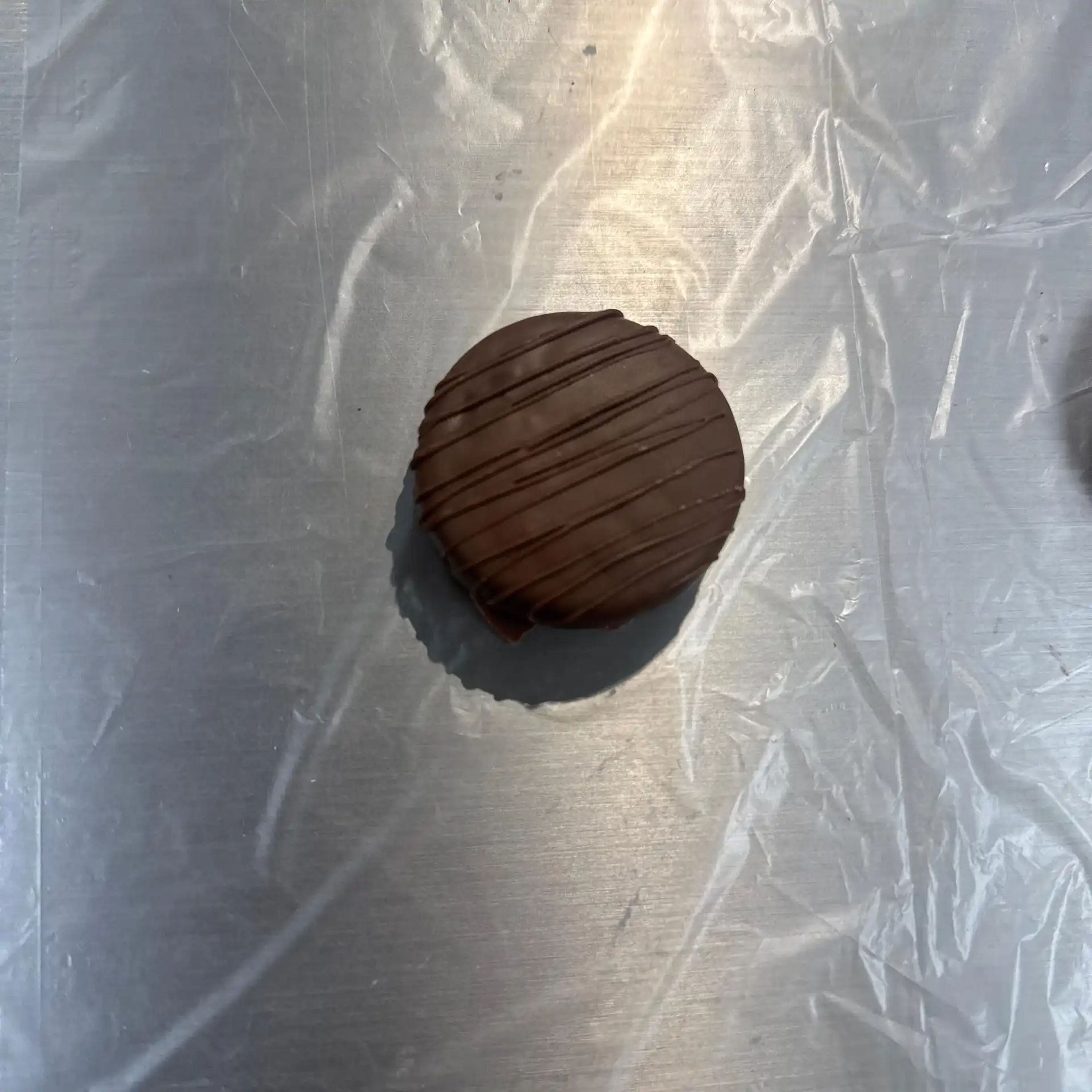 An Oreo cookie enveloped in smooth milk chocolate, typically adorned with delicate chocolate stripes.