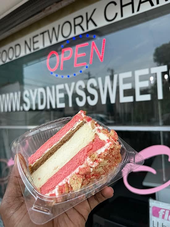 Viral Best Seller Two Layers of Strawberry Cake sandwich a Creamy Rich Cheesecake with Graham Cracker Crust, frosted with Buttercream and covered in Strawberry Cookie Crunch. 3 desserts in one!