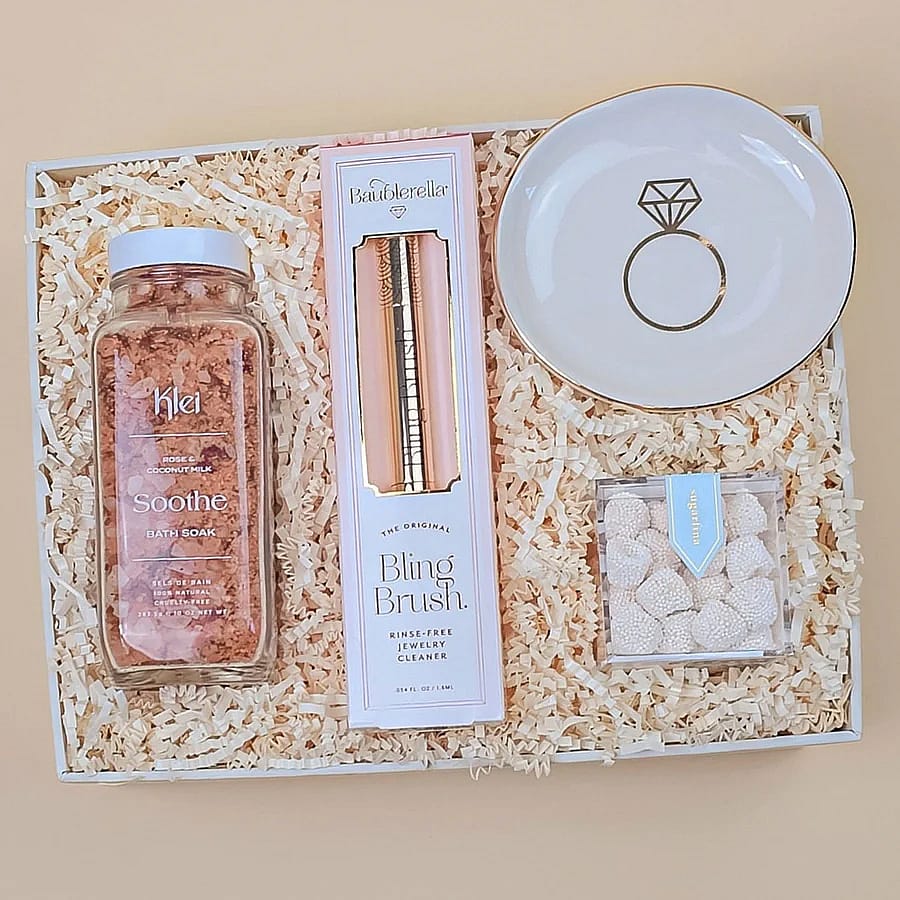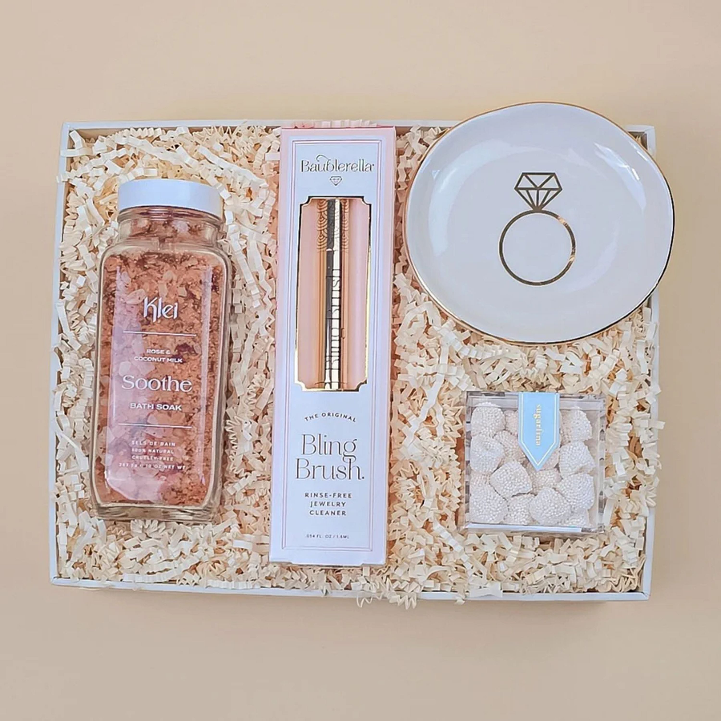 Pamper the blushing bride with the Bride Box from Giftmix. This exclusive gift box includes a relaxing bath soak, a jewelry cleaner to keep her jewels sparkling, a delicate jewelry tray to store her trinkets, and a candy box to satisfy her sweet tooth. An elegant and thoughtful gift box for the modern bride.