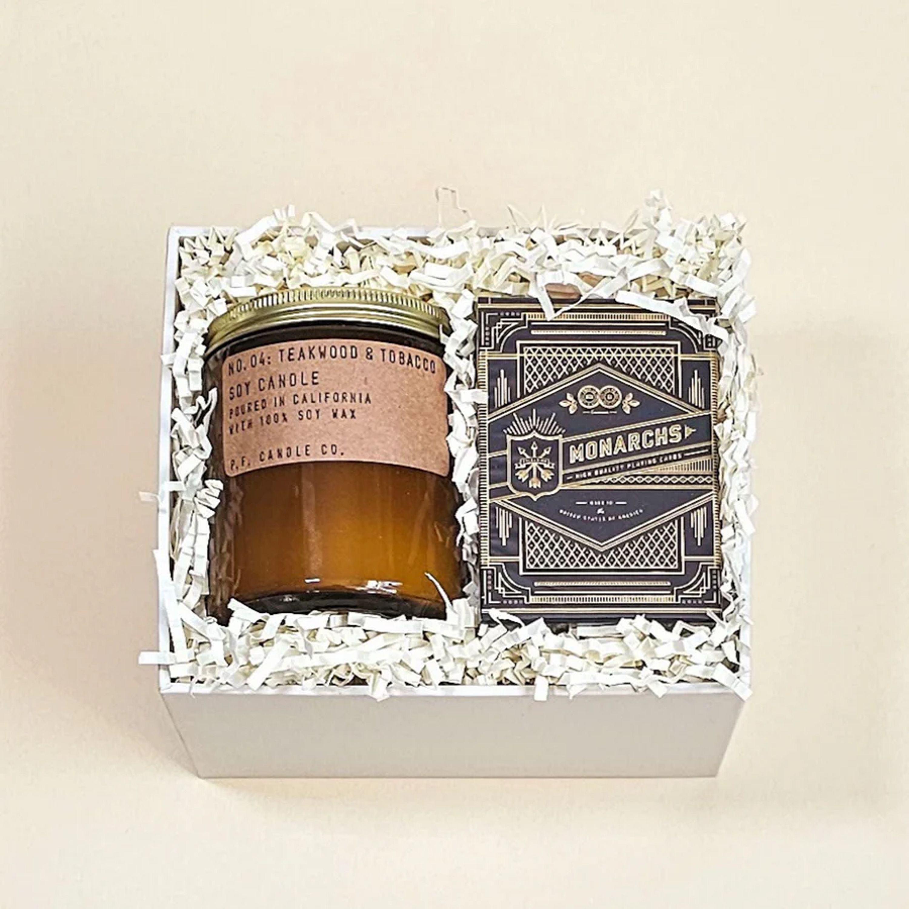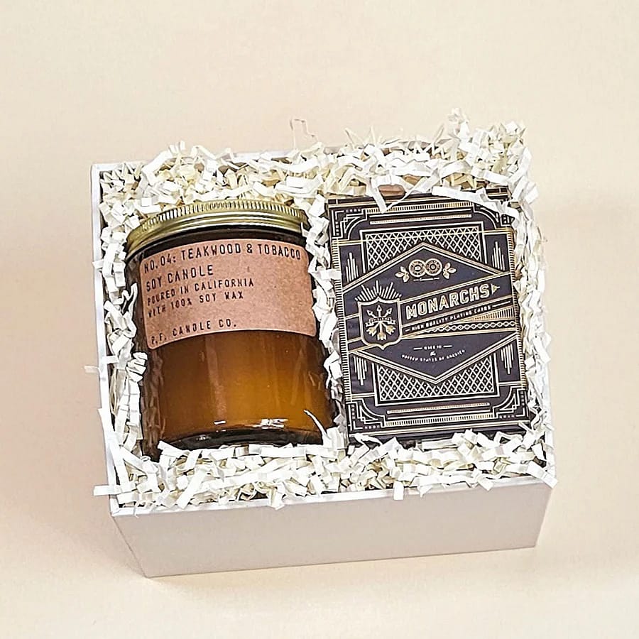 Experience a sophisticated evening of entertainment with our exclusive gift set. Perfect for gifts or a night in, this luxurious combination of a sleek playing card set and a delightful scented candle make the perfect choice for discerning gentlemen.