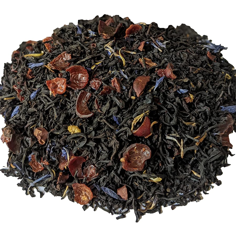 Ingredients: Black Tea, Keenum Concerto Tea, Rose Hips, Cocoa Nibs, Lapsang Souchong Tea, Whiskey Flavor, Blue Cornflowers, Natural Candy Apple Flavor & Natural Vanilla Flavor