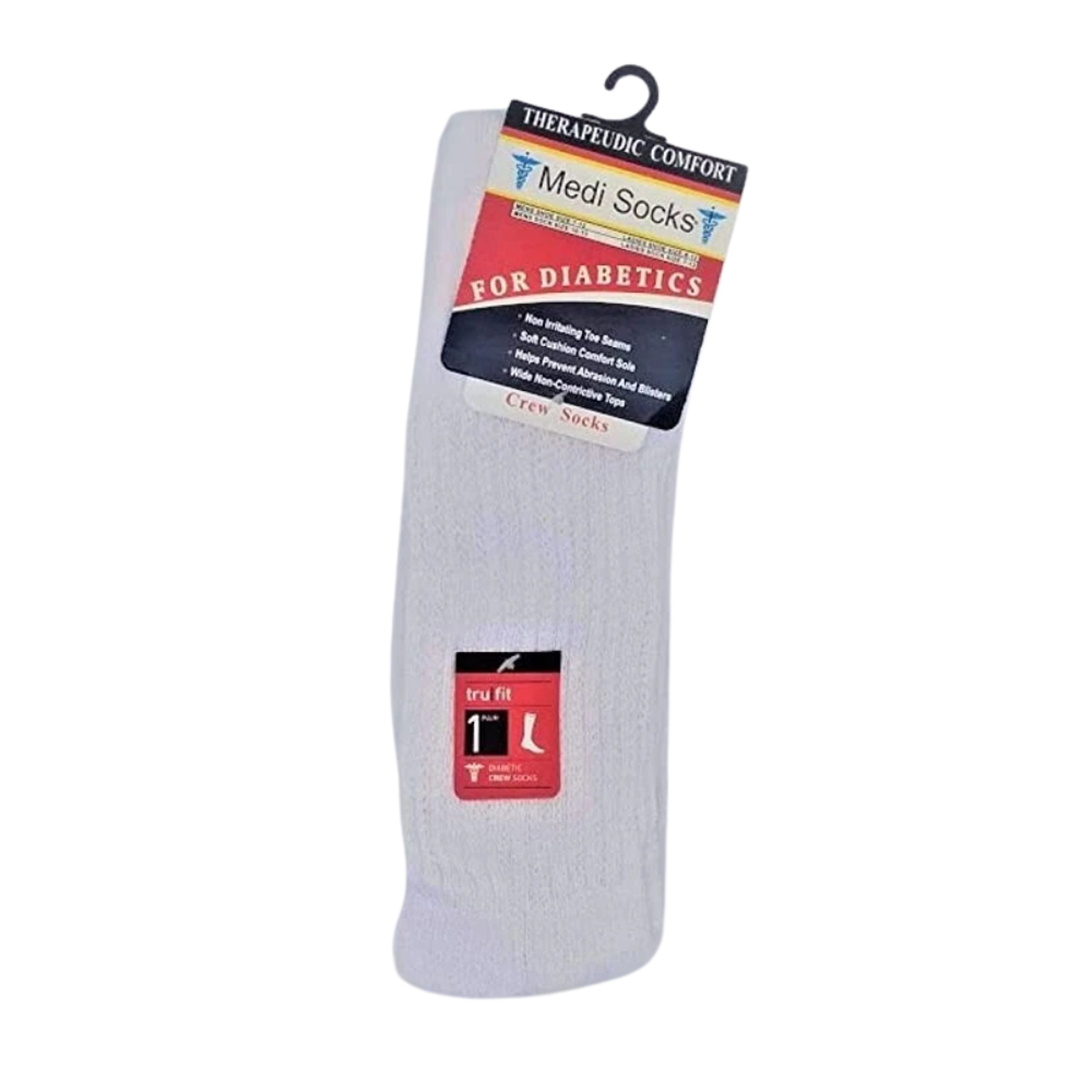 Tru Fit Diabetic White Crew Socks (2-pack) are designed for sensitive feet, featuring a non-binding, loose-fit top to improve circulation and reduce constriction. These white, crew-length socks typically feature non-irritating, seamless toes, moisture-wicking materials, and are suitable for diabetic, edema, or sensitive foot care.