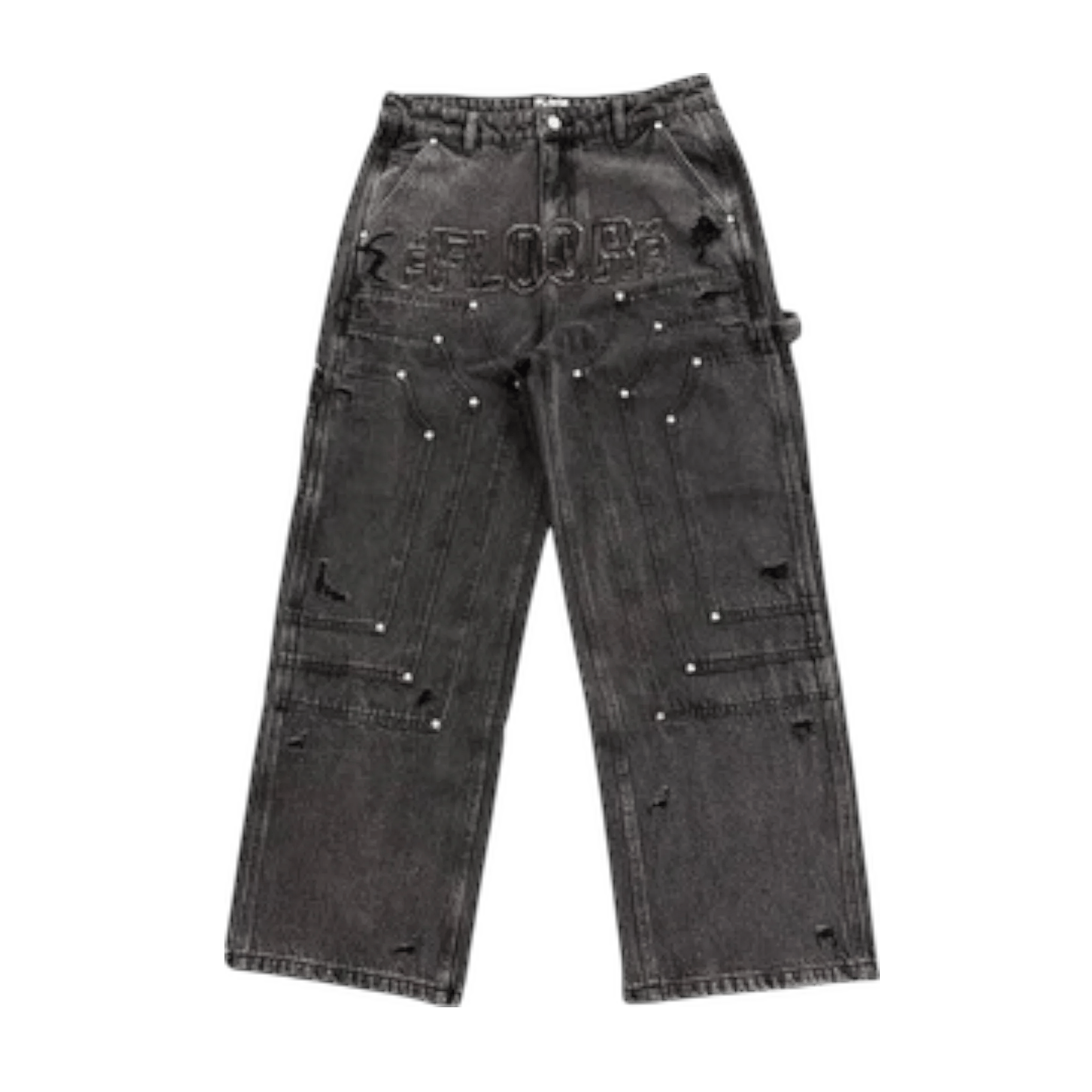 14–16 oz heavyweight denim Relaxed / baggy fit with natural stack Branded metal rivets + custom button Custom distressing Stone wash Straight leg denim Leather FFLOORR patch