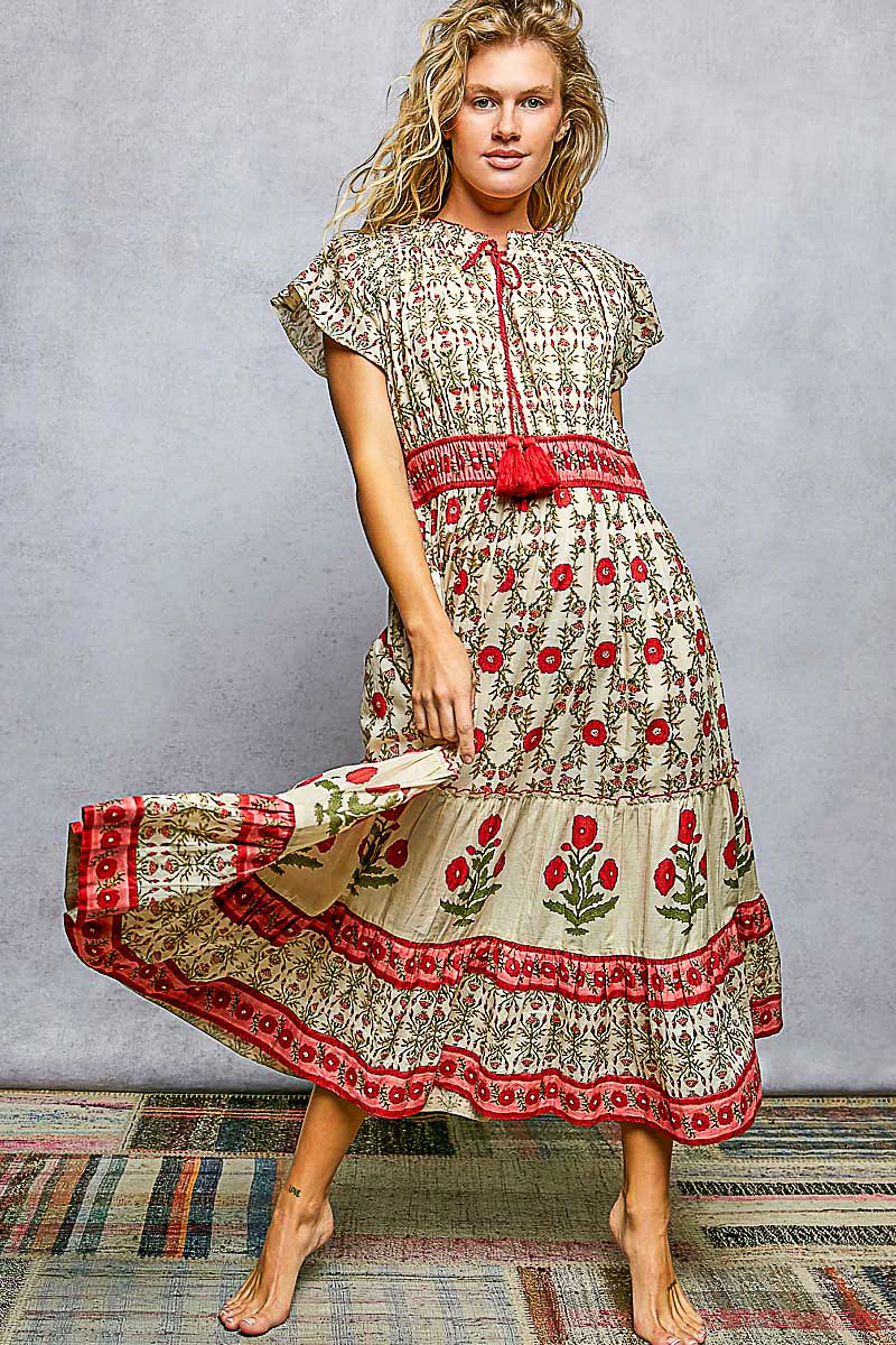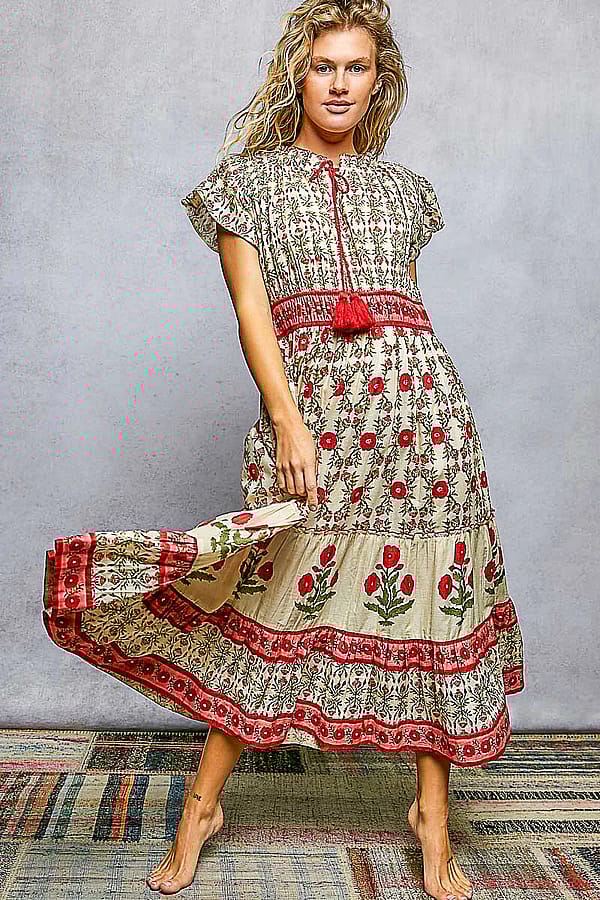 A lightweight, floor-length maxi patterned in an all-over floral print with ruffle cap sleeves and a tasseled tie at the neckline. The Lightweight Floral Ruffle Sleeve Tassel Tie Maxi Dress by POL is cut in airy fabric for easy movement and a relaxed boho silhouette. Wear it for beachside vacations or casual summer days when you want a romantic, free-spirited look. This item is crafted using traditional HAND BLOCK PRINTING, a fully manual process that may show slight variations in color, alignment. These natural differences are not flaws, but a beautiful reflection of the artisanal process, making each piece truly unique and one of a kind.