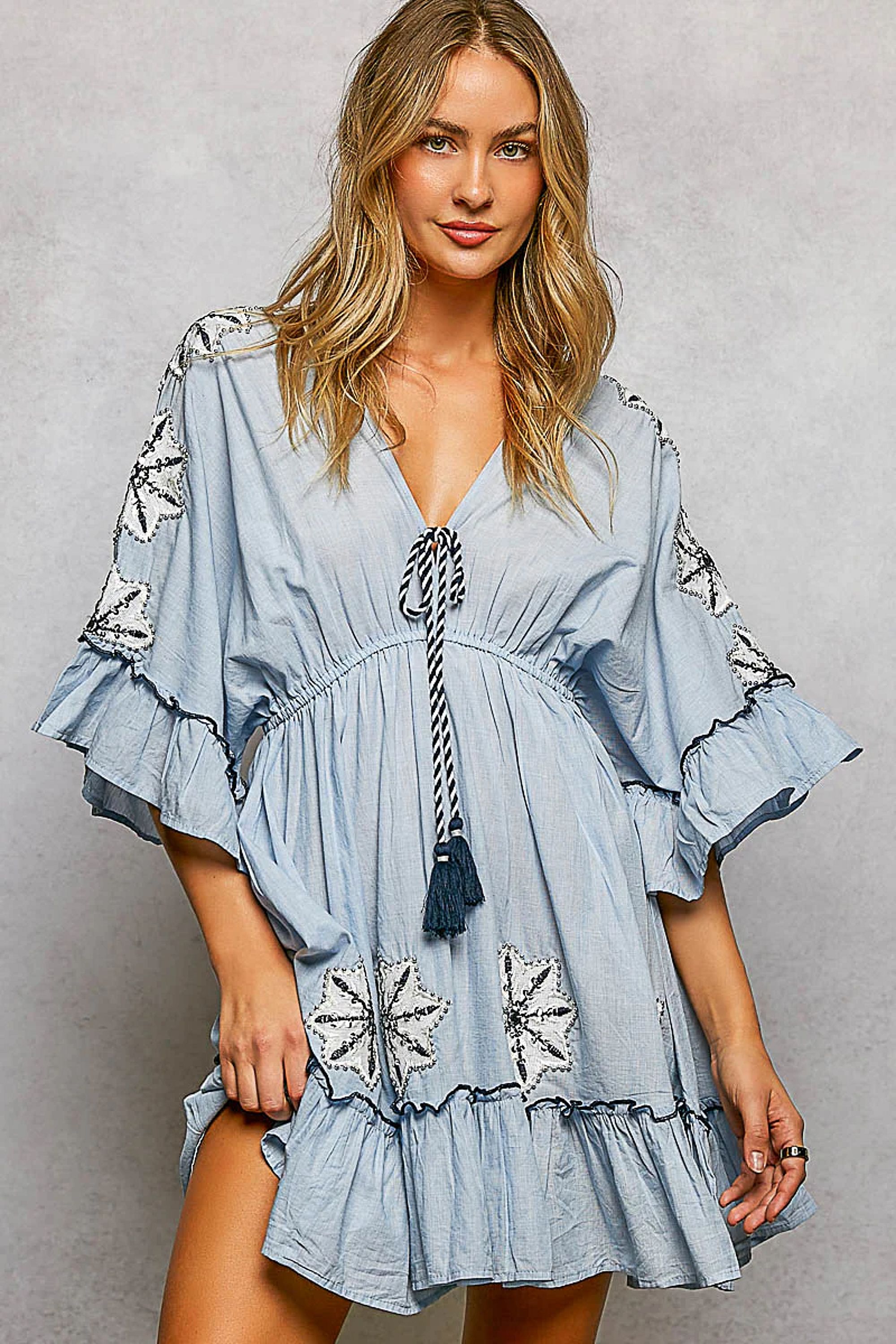 A breezy short dress cut from light denim with ruffled sleeves and embroidered panels for a relaxed, bohemian feel. The Light Denim Ruffle Sleeve Short Dress features a V-neck with a tasseled tie and a gathered empire waist that skims the mini hem. POL designed this piece for casual days and easy vacation packing, pairing soft denim texture with playful ruffle details.
