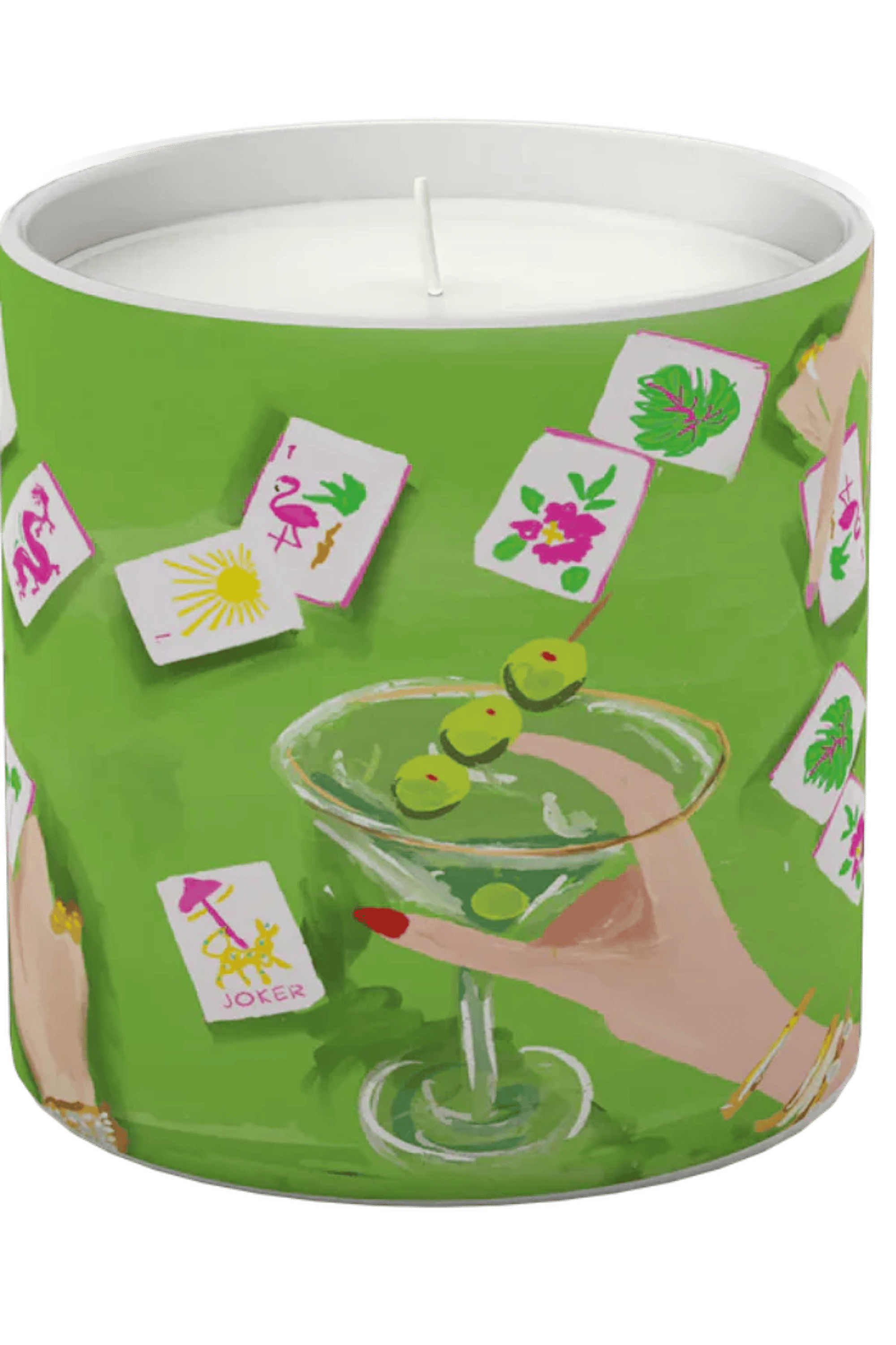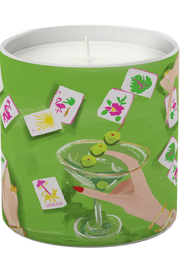 A playful scented candle decorated with Rebecca Illustrated’s Mahjong-themed artwork. The Annapolis Candle Bams Club Mahjong Candle features a painted glass vessel wrapped in a vibrant green scene of mahjong tiles and a cocktail motif. It burns from a single cotton wick and makes a lively accent for a coffee table, bar cart, or bedside. Annapolis adds a whimsical, giftable touch to entertaining and home fragrance with this illustrated design.