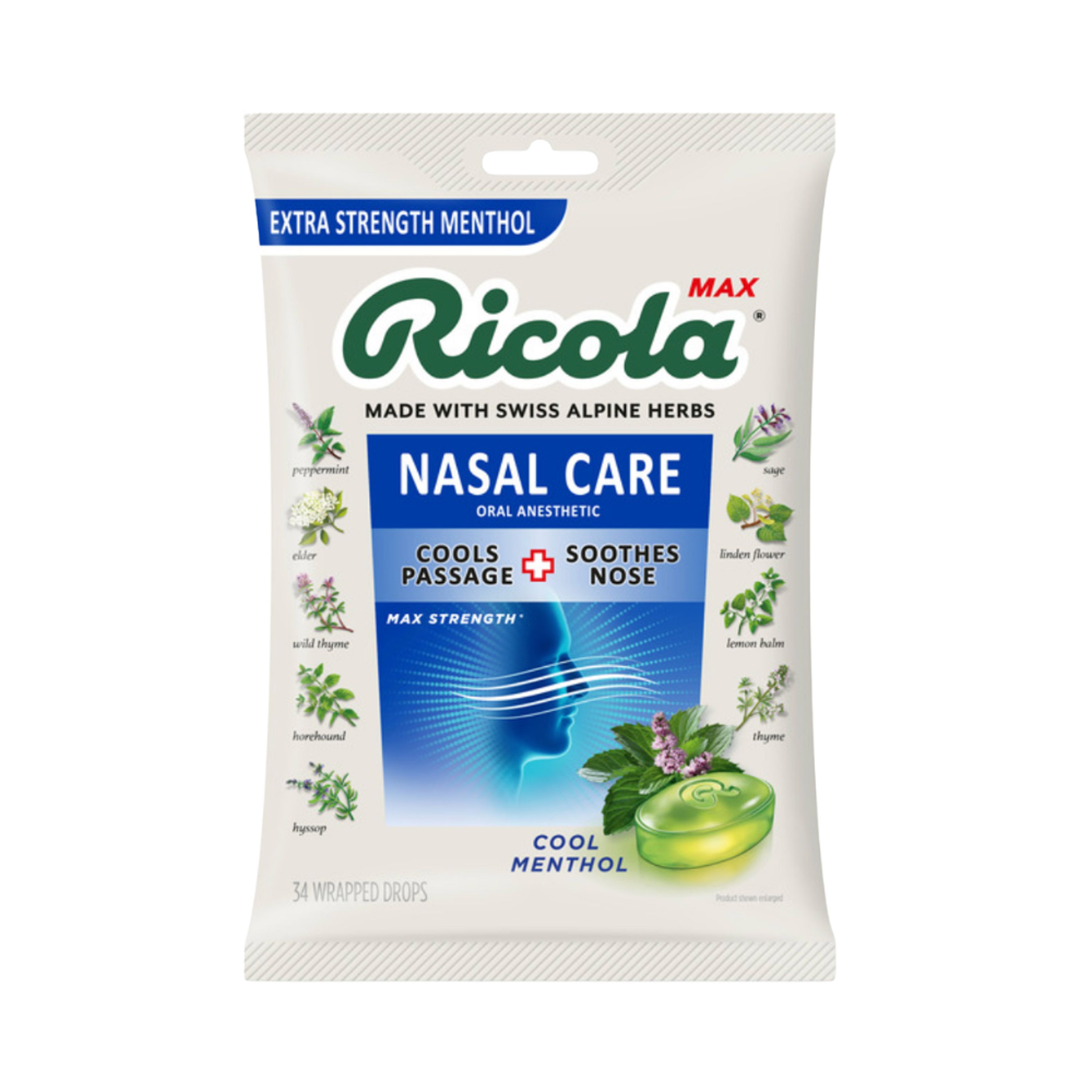 Experience maximum nasal comfort and sore throat relief with Ricola MAX Nasal Care Throat Drops. Each drop delivers extra menthol, 3x more than Ricola Original Herb Throat Drops, to soothe throat irritation and cool nasal passages. Ricola MAX helps ease throat irritation, discomfort, and dryness to help you speak more comfortably. Made with Ricola's signature Swiss Alpine herb blend and extra menthol, these herbal throat lozenges combine naturally refreshing flavor with effective relief from cold and flu symptoms. Whether you're battling a sore throat or irritated nasal passages, Ricola MAX Nasal Care delivers cooling, menthol relief you can count on. Stock up for home, work, and travel so soothing relief is always within reach.