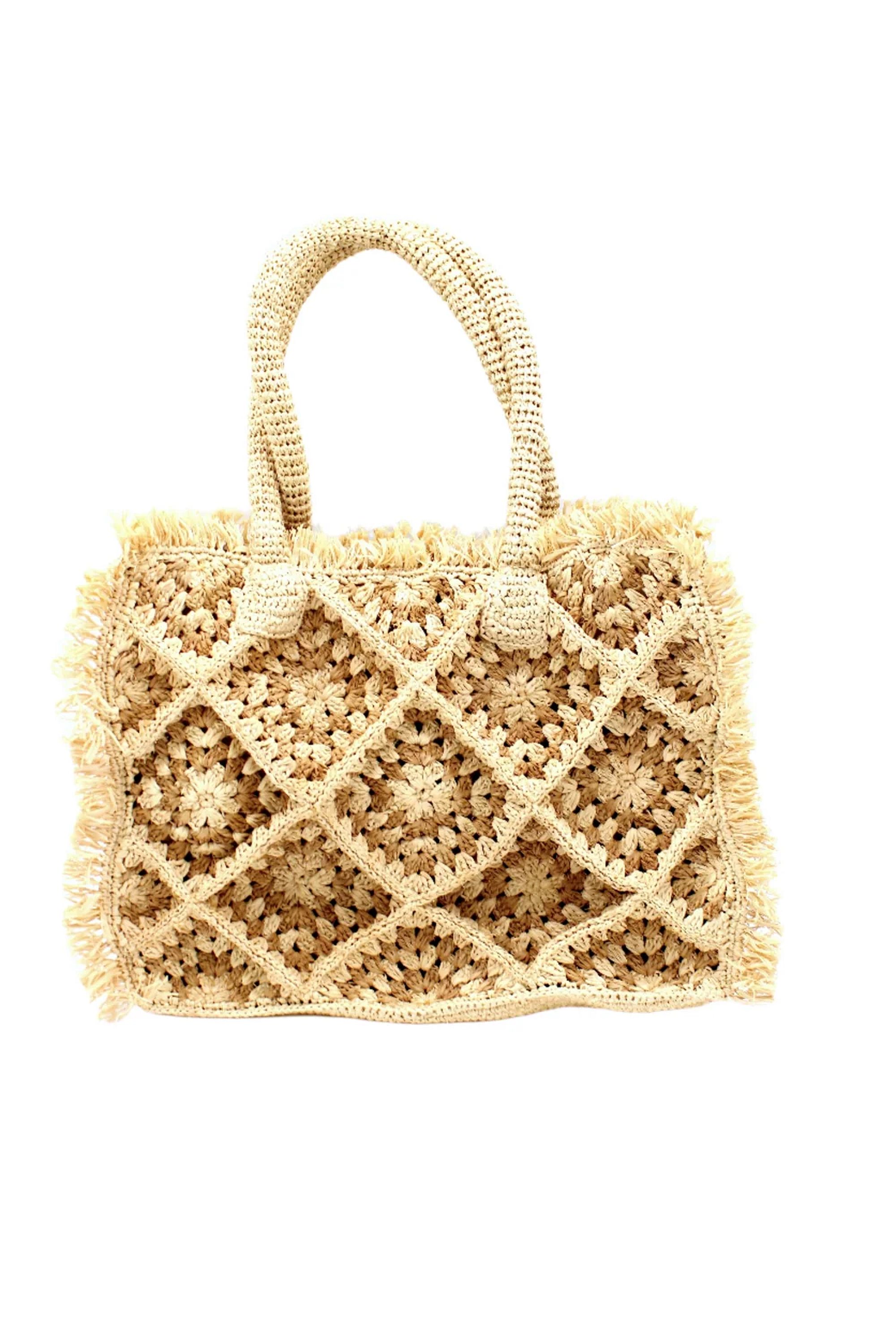 Shebobo Leo Cappuccino & Natural Crochet Granny Square Pattern Fringed Straw Shoulder Bag is a handcrafted-looking straw shoulder bag with crochet granny-square panels and fringe trim for a relaxed, bohemian feel. The bag’s roomy rectangular silhouette and padded woven handles make it easy to carry for market runs or beach days. This piece is by Shebobo and pairs naturally with casual summer dresses or linen separates.