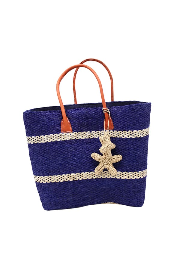 The Shebobo Havana Sisal Basket Bag with Starfish Charm is a roomy woven tote designed for sunny days and effortless errands. Made from sisal straw with contrast leather handles, the structured silhouette holds essentials while keeping a light beach-ready feel. A crocheted starfish charm adds a playful seaside accent to the deep blue weave. Shebobo captures vacation-ready style in a practical everyday carryall.