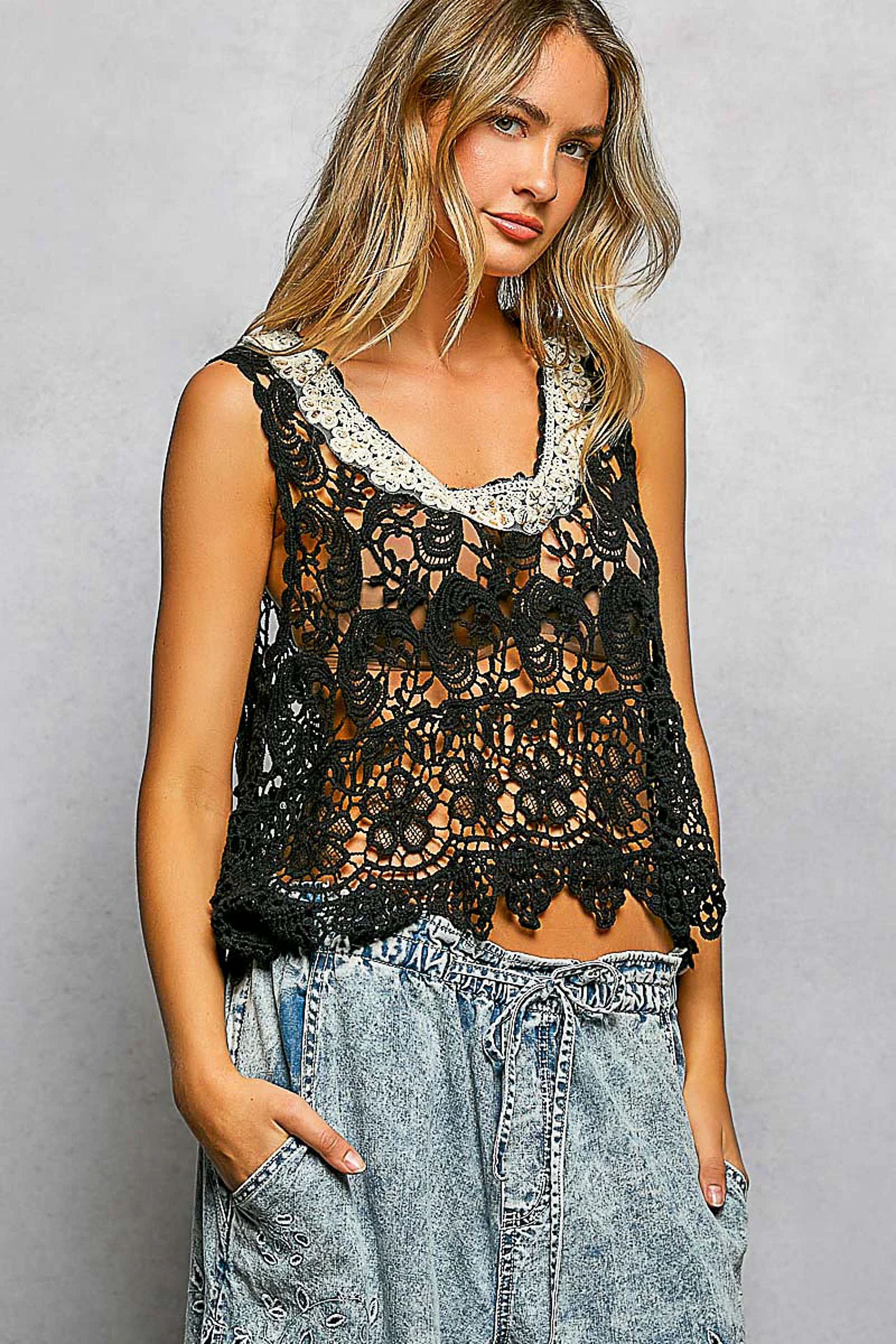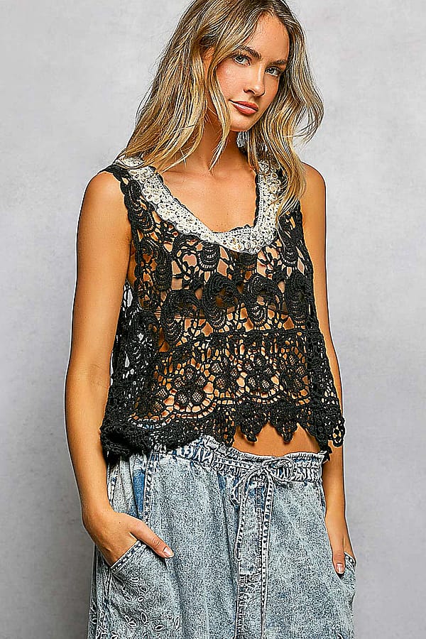 A breezy crochet tank with openwork stitching and a scalloped hem, perfect for warm-weather styling. The POL Black Crochet Tank Top pairs a relaxed cropped silhouette with a scooped neckline for effortless layering. Handcrafted-feel crochet gives a bohemian, vacation-ready vibe while remaining casual enough for everyday wear. Pair it over a bralette or swimsuit for beach days or festival looks.