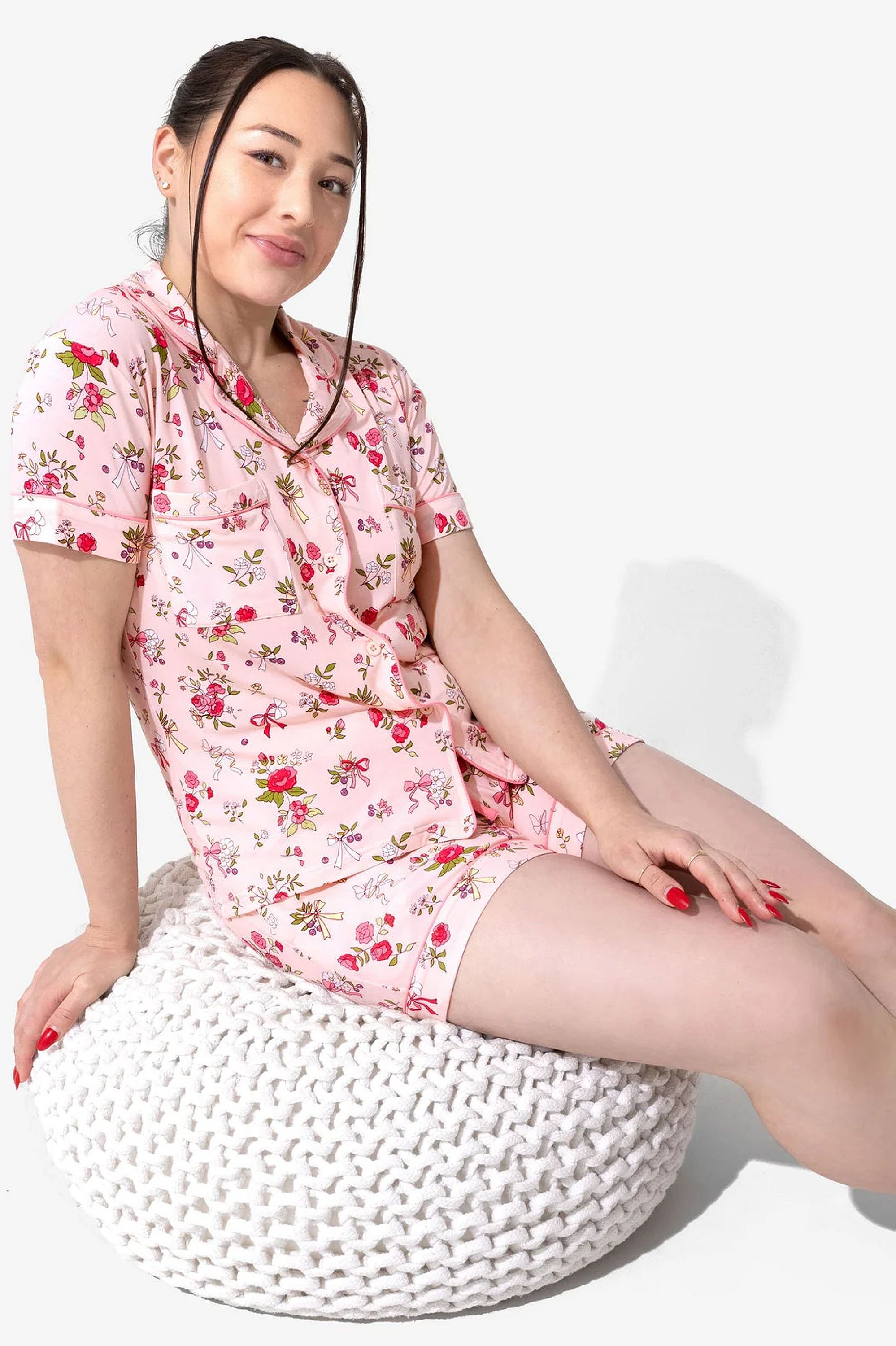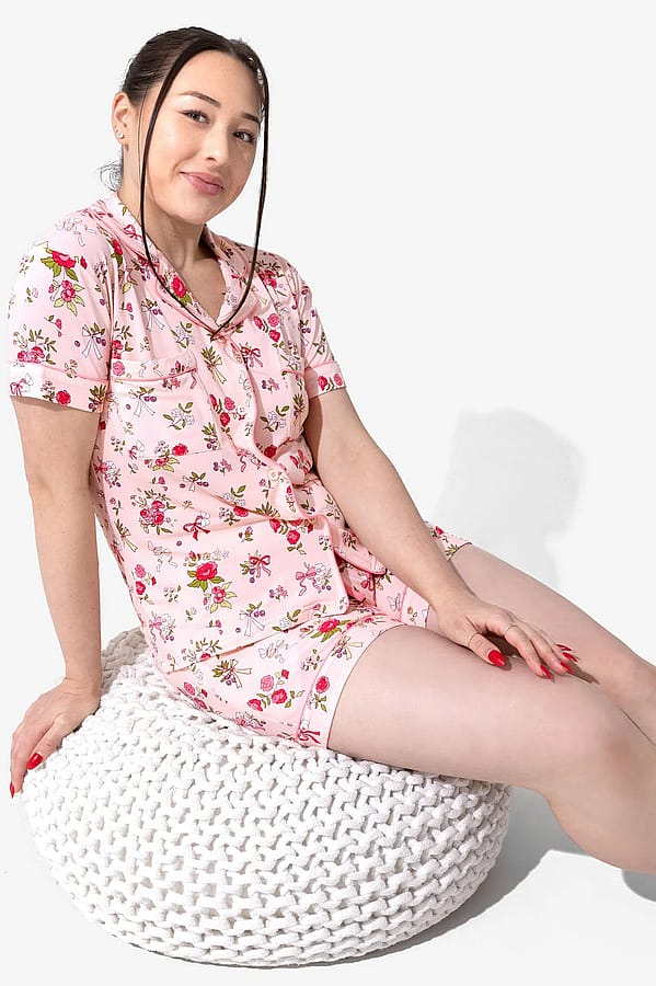 Slip into the Bellabu Bear Bows & Blooms Women's Pajama Short Set, a floral-printed two-piece sleep set with a short-sleeve button-front top and matching shorts. The lightweight knit construction and relaxed silhouette make it perfect for cozy nights at home. Bellabu Bear finishes the set in a soft pink bows-and-blooms print for a romantic, feminine vibe.
