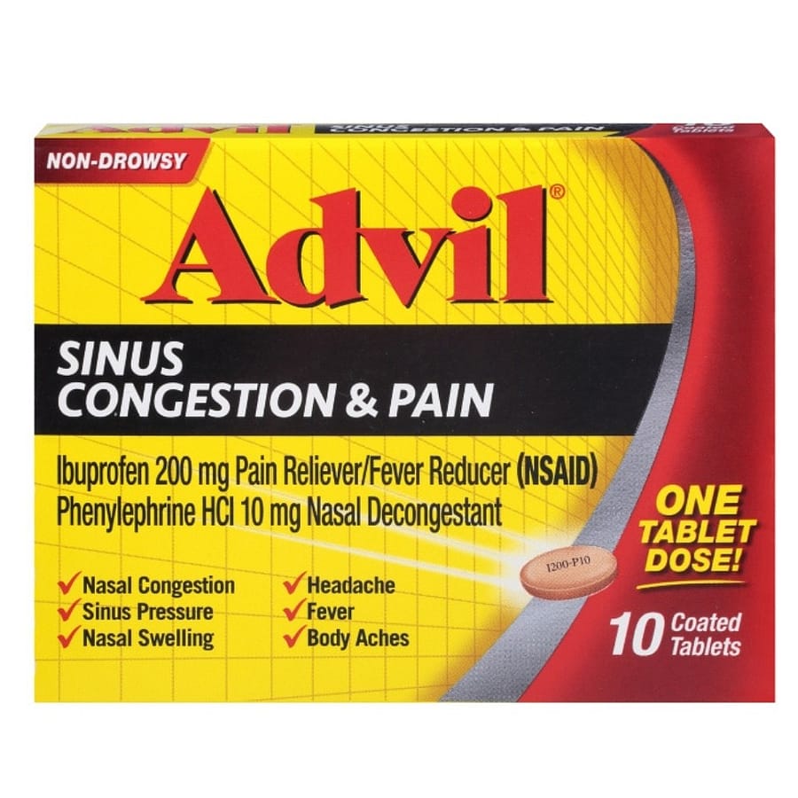 Advil Sinus Congestion & Pain Tablets provide targeted relief from sinus pressure, nasal congestion, and pain caused by colds or allergies. This combination formula contains a pain reliever and a nasal decongestant that work together to help reduce sinus swelling while easing headaches, facial pressure, and body aches. The tablets help clear blocked nasal passages and relieve discomfort so you can breathe easier and feel more comfortable throughout the day.