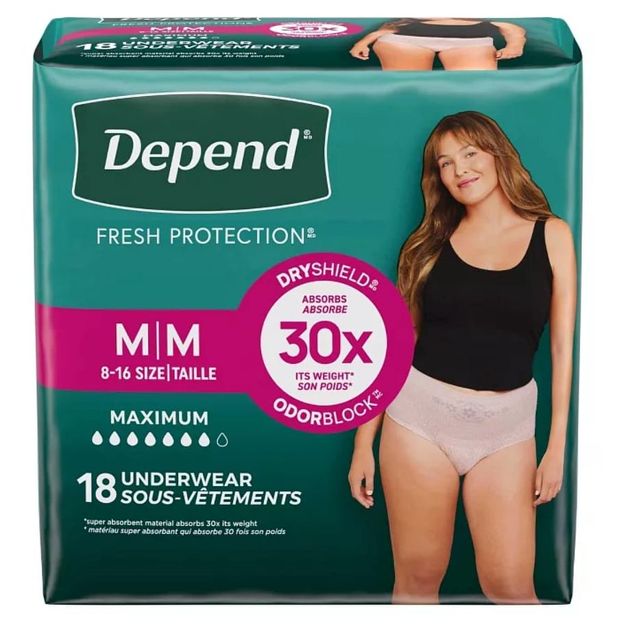 Depend Maximum Absorbency Underwear for Women is designed to provide reliable protection and comfort for bladder leaks. This disposable underwear offer maximum absorbency to help keep you dry and confident throughout the day or night. The soft, flexible material fits comfortably like regular underwear while the absorbent core quickly locks away moisture and helps control odors. With a secure yet comfortable fit, the depend underwear moves with your body to provide discreet protection under clothing.
