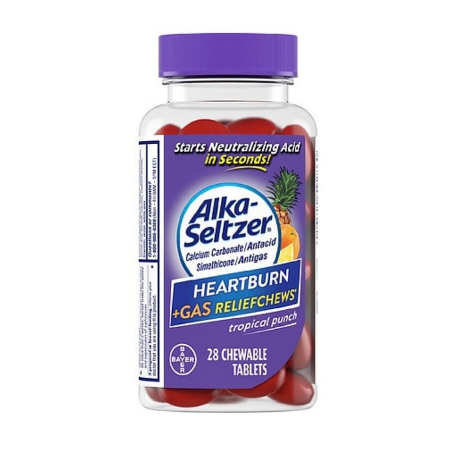 Alka-Seltzer Heartburn + Gas Relief Chewable Tablets are designed to provide fast relief from heartburn, acid indigestion, and gas discomfort. The chewable tablets work by neutralizing excess stomach acid while also helping break up gas bubbles that can cause bloating and pressure. The easy-to-chew formula starts working quickly to relieve burning in the chest and uncomfortable gas buildup after meals. These tablets are convenient to take when symptoms occur and do not require water.