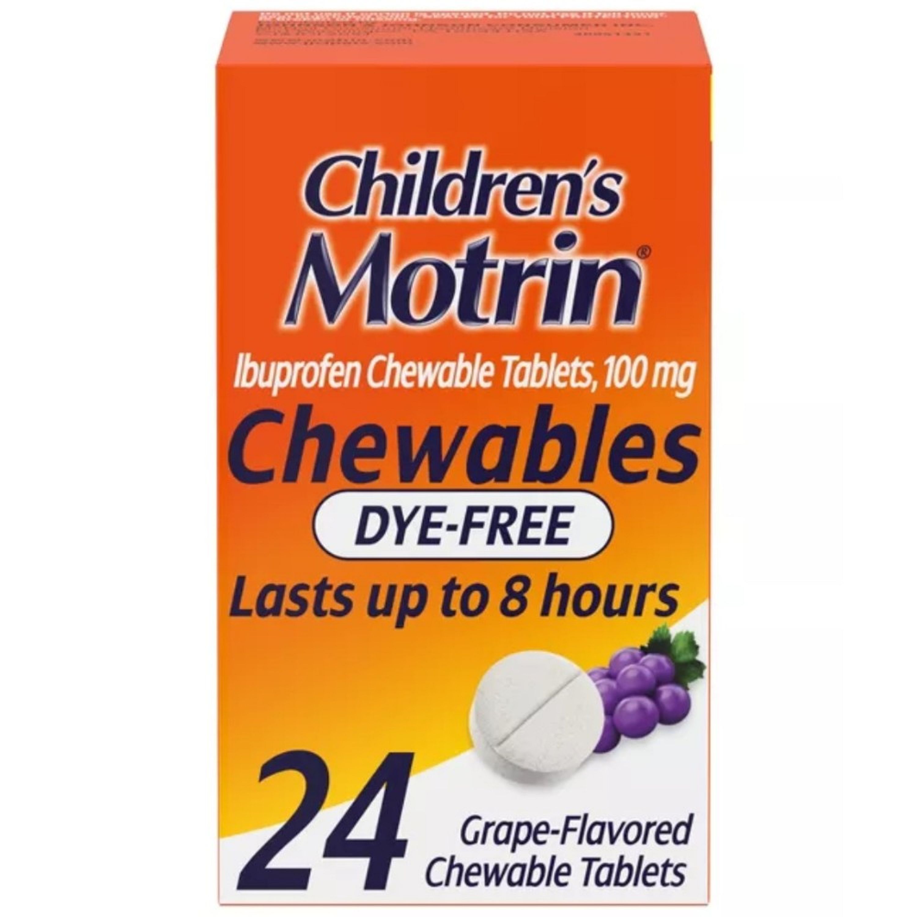 Children’s Motrin 100 mg Chewable Tablets are designed to help relieve pain and reduce fever in children. These chewable tablets contain ibuprofen, a nonsteroidal anti-inflammatory drug (NSAID) that helps reduce inflammation while easing common discomforts such as headaches, toothaches, sore throat, minor aches, and fever from colds or flu. The chewable form makes it easier for children to take without needing to swallow a pill, providing convenient relief when they need it.