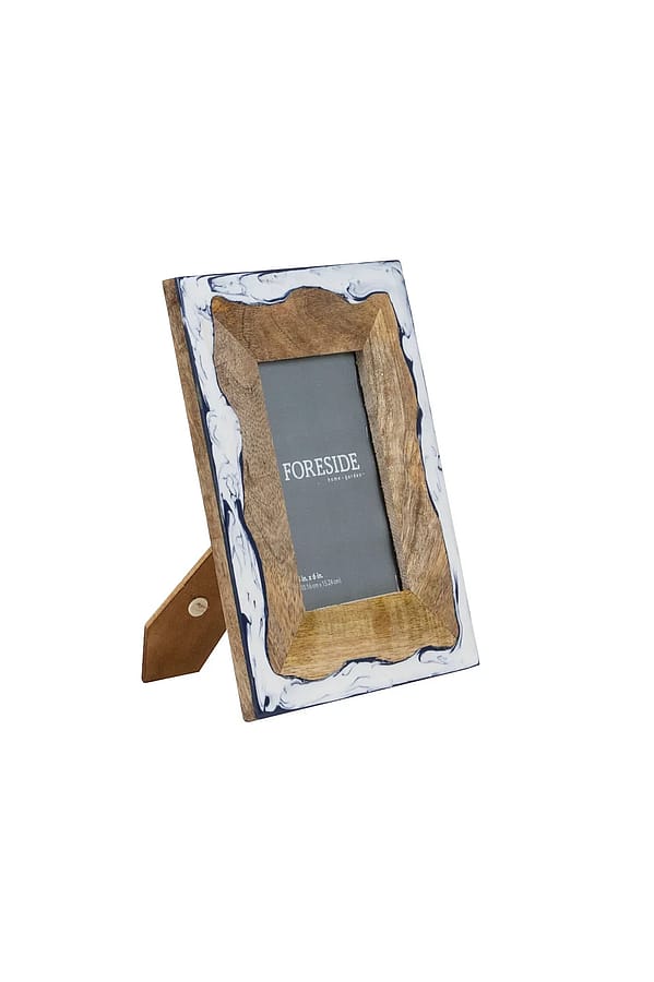 A compact decorative picture frame designed for a 4x6 photo, featuring a rustic wood inner trim and a white-and-blue marbled outer border. The Foreside Home & Garden Varuna 4x6 White & Blue Marbled Frame brings a coastal-meets-craft aesthetic to tabletops or shelves. Its sculpted wooden opening and glossy marbled surround create depth and visual interest for small prints or snapshots. Use it alone as a statement accent or grouped with other frames for a curated vignette.