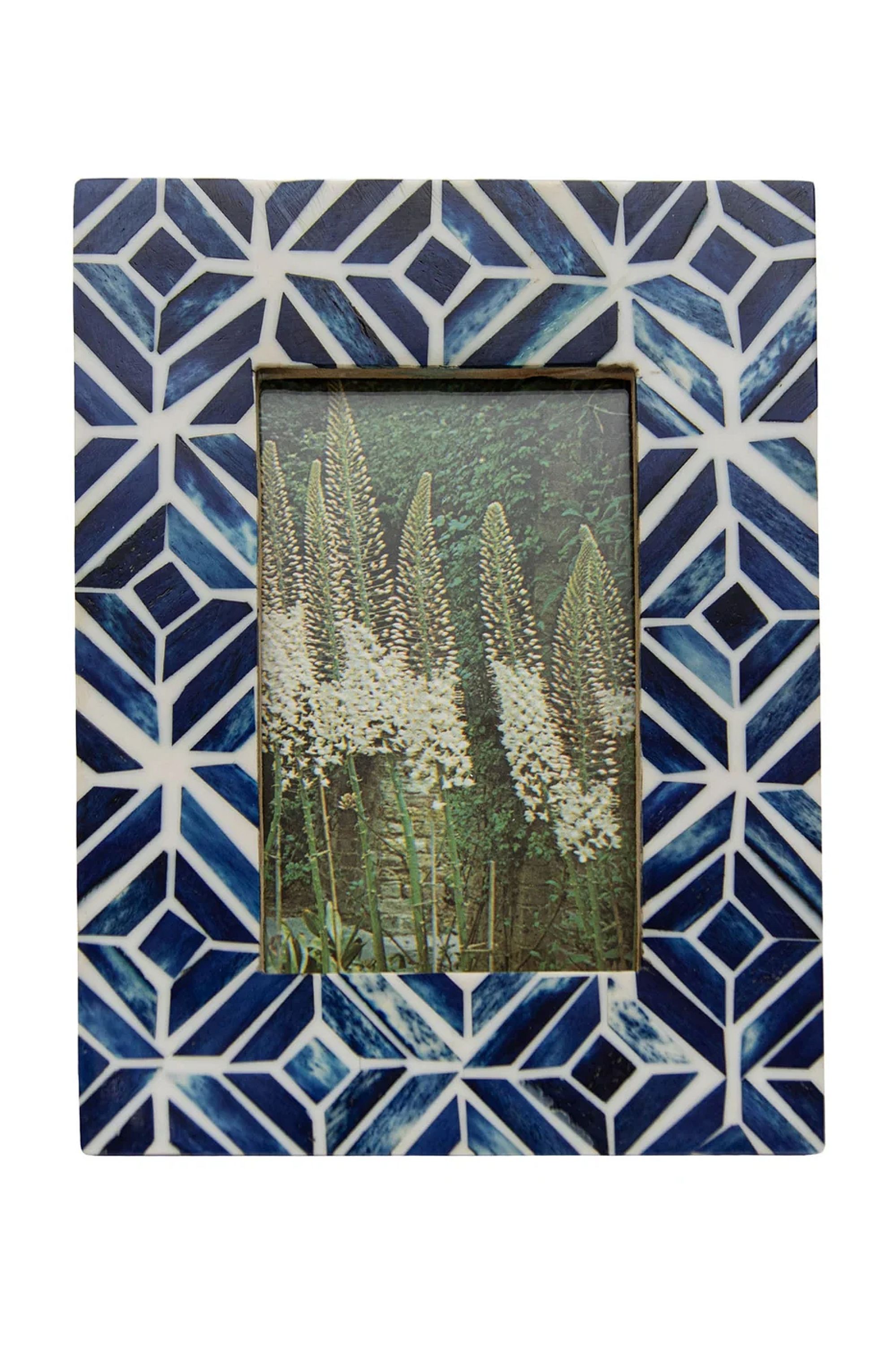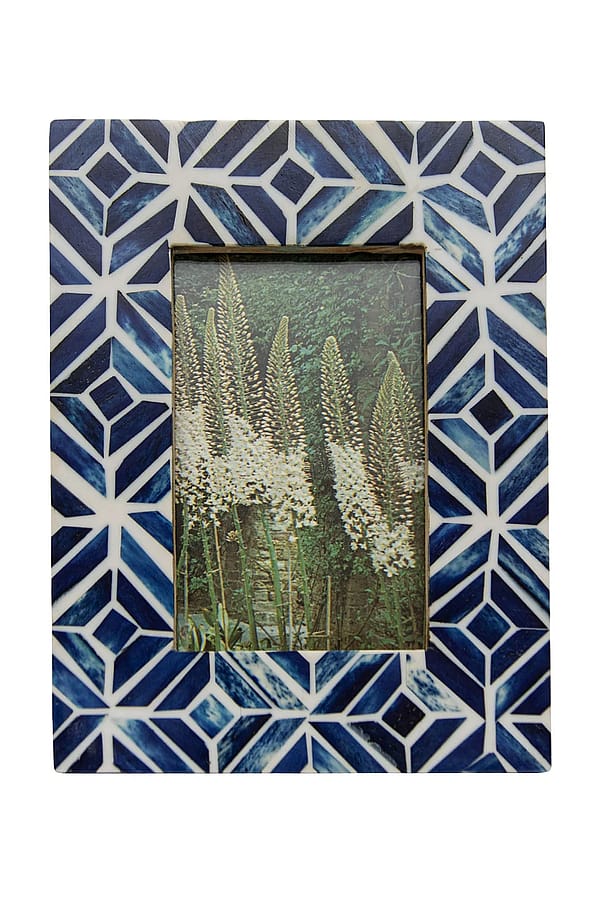 The Foreside Home & Garden Celestina 4x6 Blue Resin Mosaic Frame is a decorative tabletop picture frame with a geometric blue resin mosaic border and a 4x6 photo opening. The glossy resin tiles create a textured, artisanal look that fits coastal or modern eclectic decor. Brand Foreside Home & Garden lends a curated, giftable quality to this compact frame.