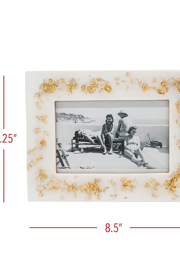 A decorative 4x6 picture frame with scattered gold flakes set into a white resin surround. The Foreside Home & Garden 4x6 Chryses Picture Frame Gold Flake pairs vintage-inspired charm with modern materials for a subtle luxe look. It holds a standard 4 by 6 photo in a rectangular opening and stands or hangs for flexible display. Use it on a shelf, mantel, or bedside table to highlight treasured snapshots.