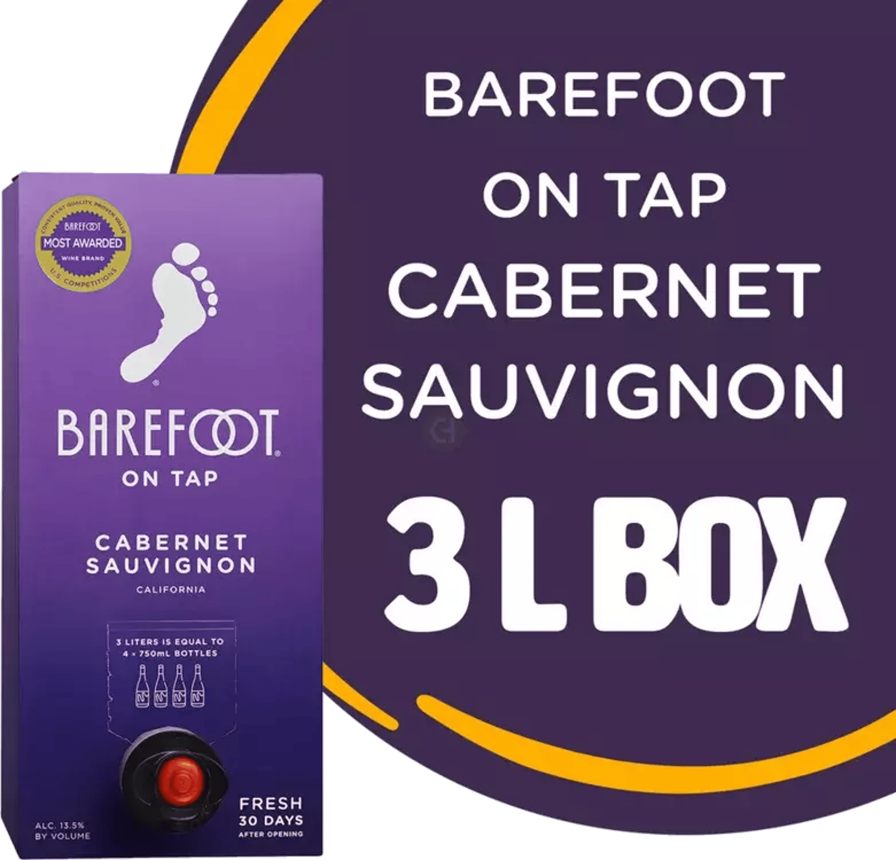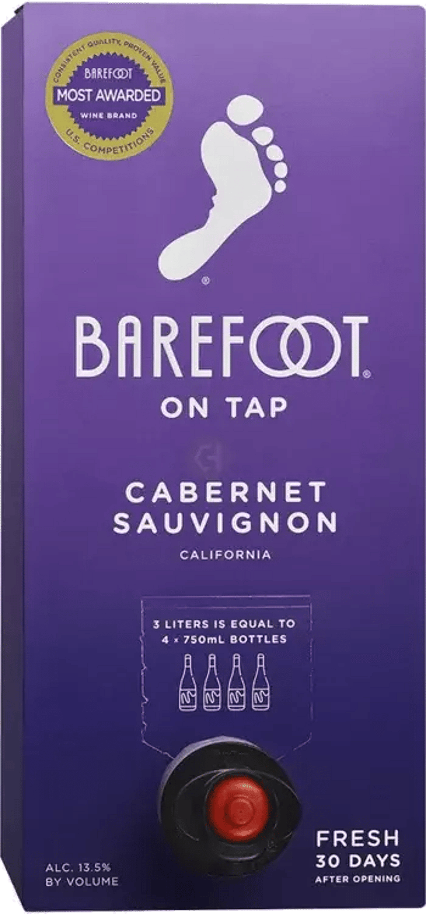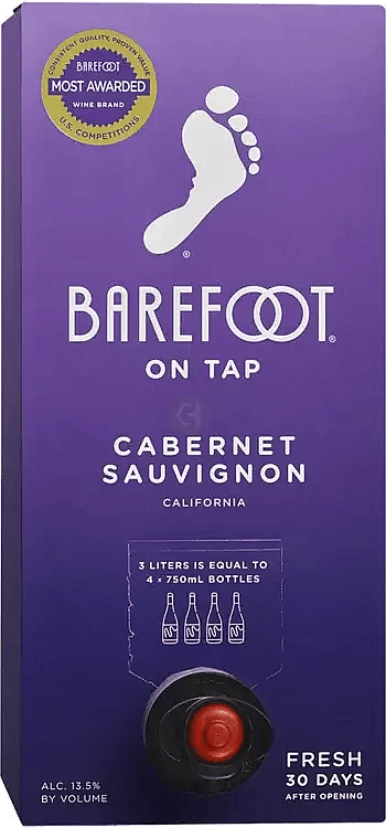 Barefoot Wine On Tap Cabernet Sauvignon Red Wine is smooth and balanced with light tannins. This red box wine has big berry notes and aromas of raspberry and blackberry with a long velvety vanilla finish. Barefoot Wine On Tap features a convenient 3 L box that keeps your wine fresh 30 days after opening. With four bottles in every box, Barefoot On Tap is ready for everything from quiet nights on the couch to big family dinners. This Barefoot wine pairs perfectly with beef, cheeseburgers or red sauce pasta dishes and is best served at room temperature. With a convenient pour spout, this boxed wine makes it easy to push open the seal, pull out the nozzle, pour and enjoy. Barefoot Cabernet Sauvignon is one of our original and most traditional red wine types.