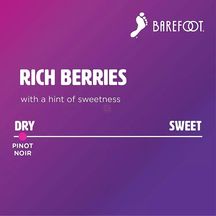Barefoot Pinot Noir Red wine features notes of black cherry and wild raspberry with hints of spice and a silky smooth finish. This perfectly portable four pack of mini wine bottles is ideal for summer picnics, backyard barbecues and beachside bashes. Best served slightly chilled or at room temperature, this medium bodied Barefoot wine pairs perfectly with a wide variety of foods. These small wine bottles are shatterproof and come with an easy to open screw cap. This Pinot Noir comes from Barefoot, the most awarded wine brand in US competitions.