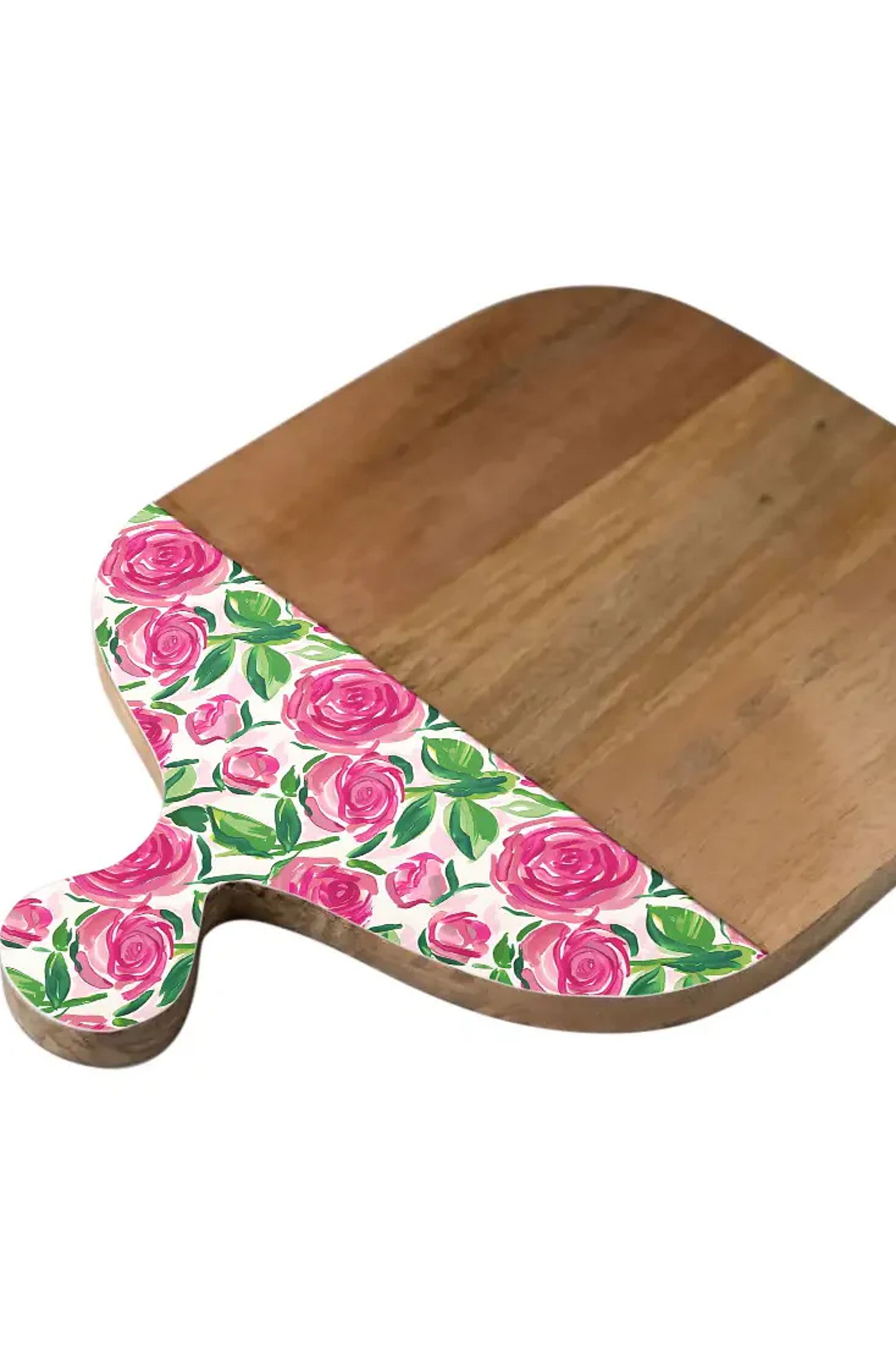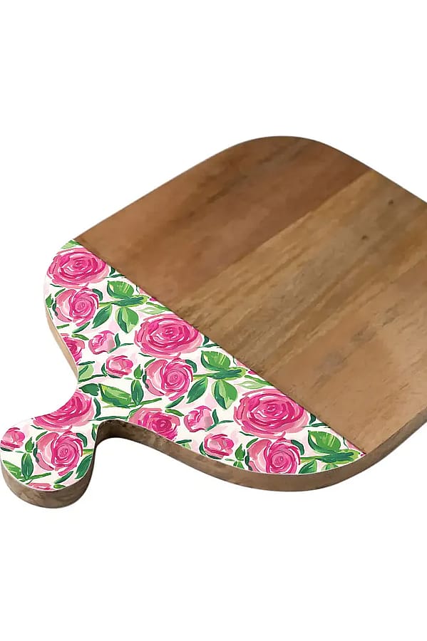 This wooden cutting board pairs practical surface area with a pretty floral-accented handle for serving and prep. The My Casita Roses 12"x16" Cutting Board is handcrafted from warm-toned wood and features a painted pink rose motif on the handle. It's sized for everyday chopping and also works beautifully as a small serving board for cheese or charcuterie. Wipe clean and condition the wood occasionally to maintain its finish.