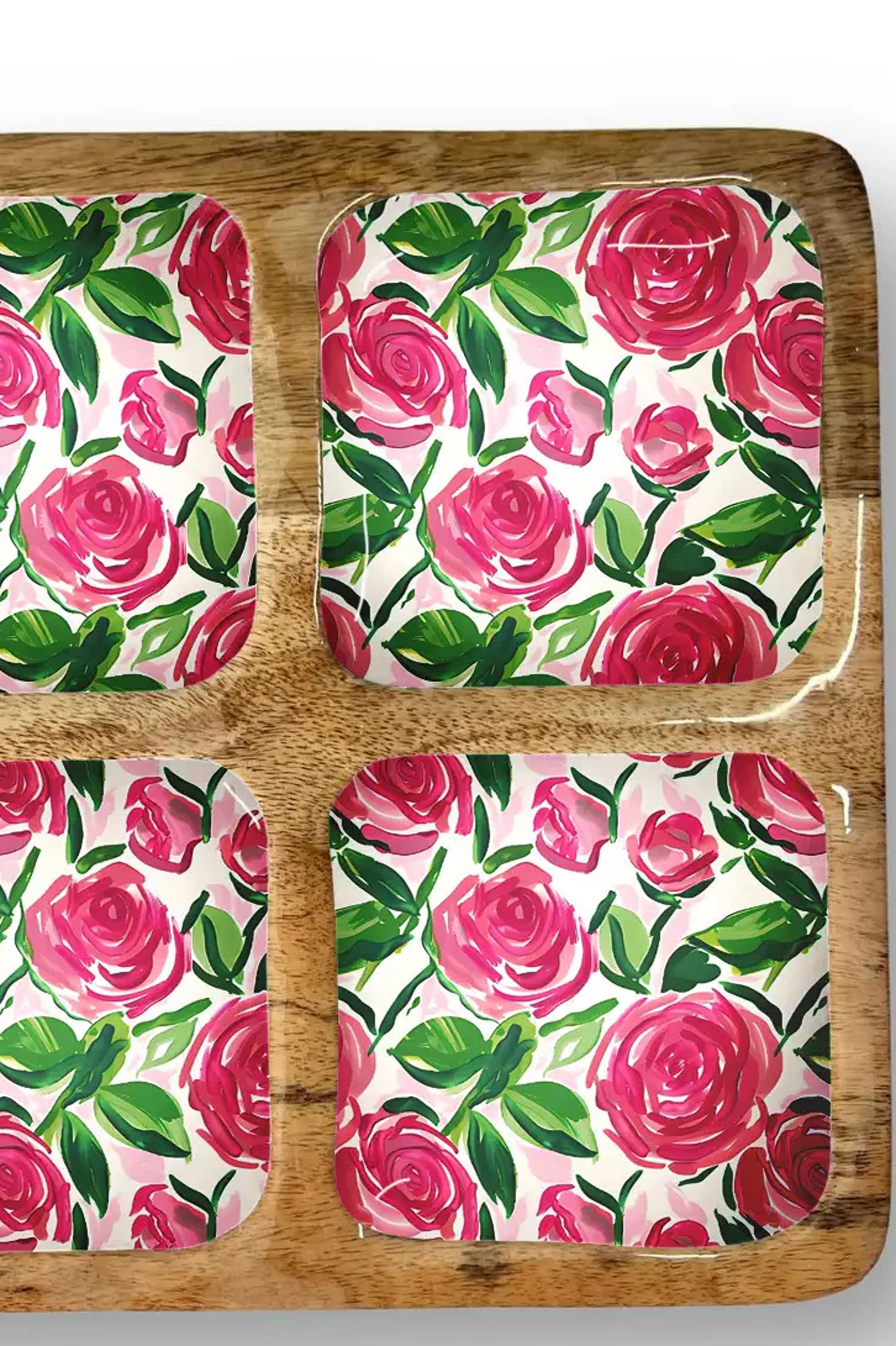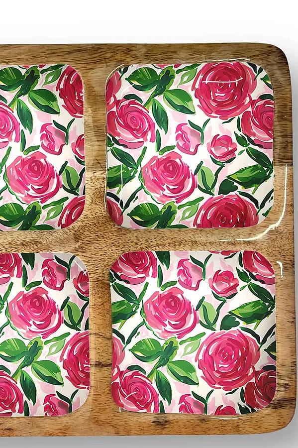 A decorative 12-inch quad serving tray designed for everyday entertaining and display. The My Casita Roses 12-inch Quad Tray features four square compartments lined with a hand-painted rose pattern set into a warm wood-look frame. Use it to serve snacks, hold condiments, or as a pretty tabletop organizer that brings a bright, floral touch to any gathering.