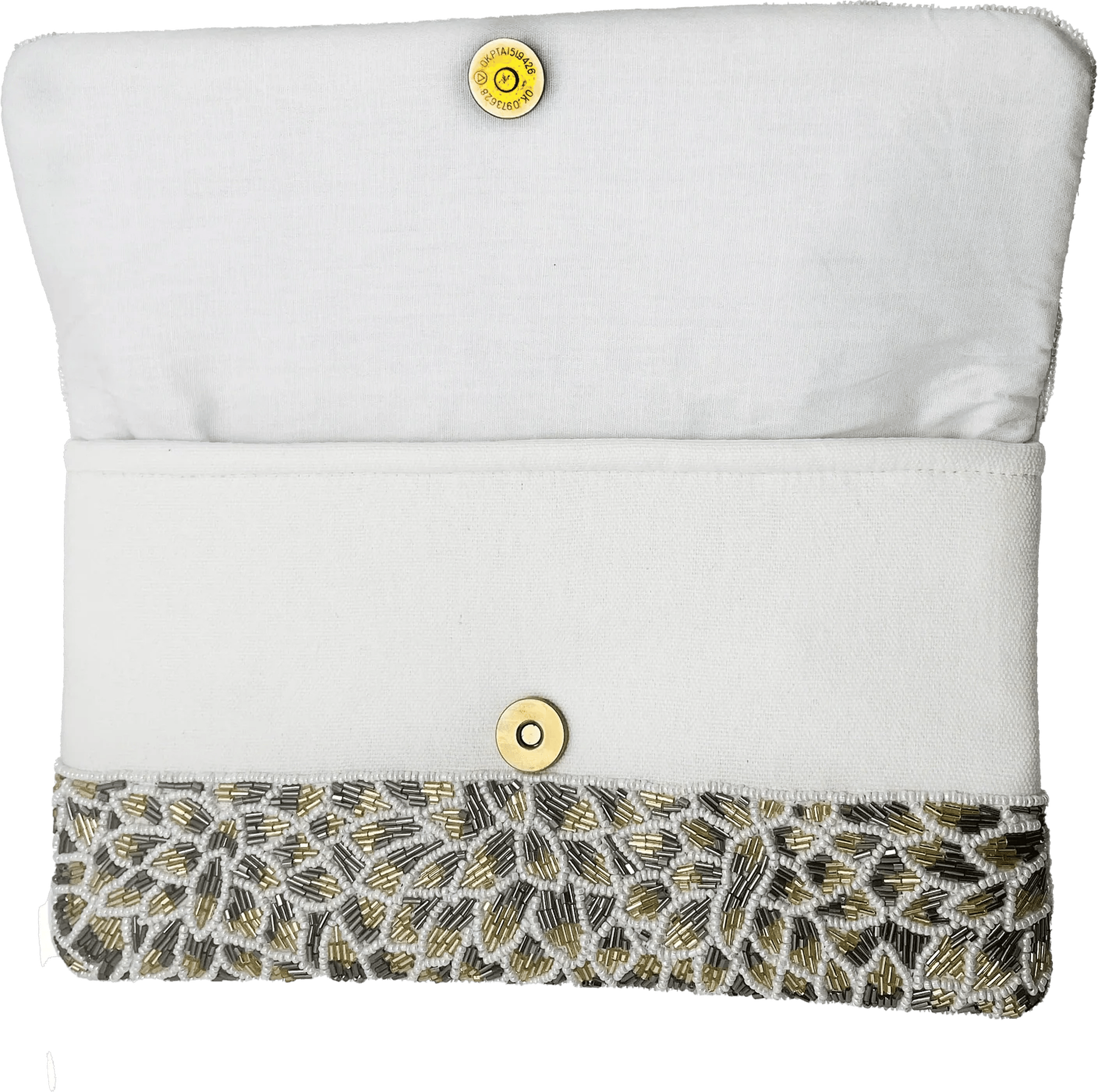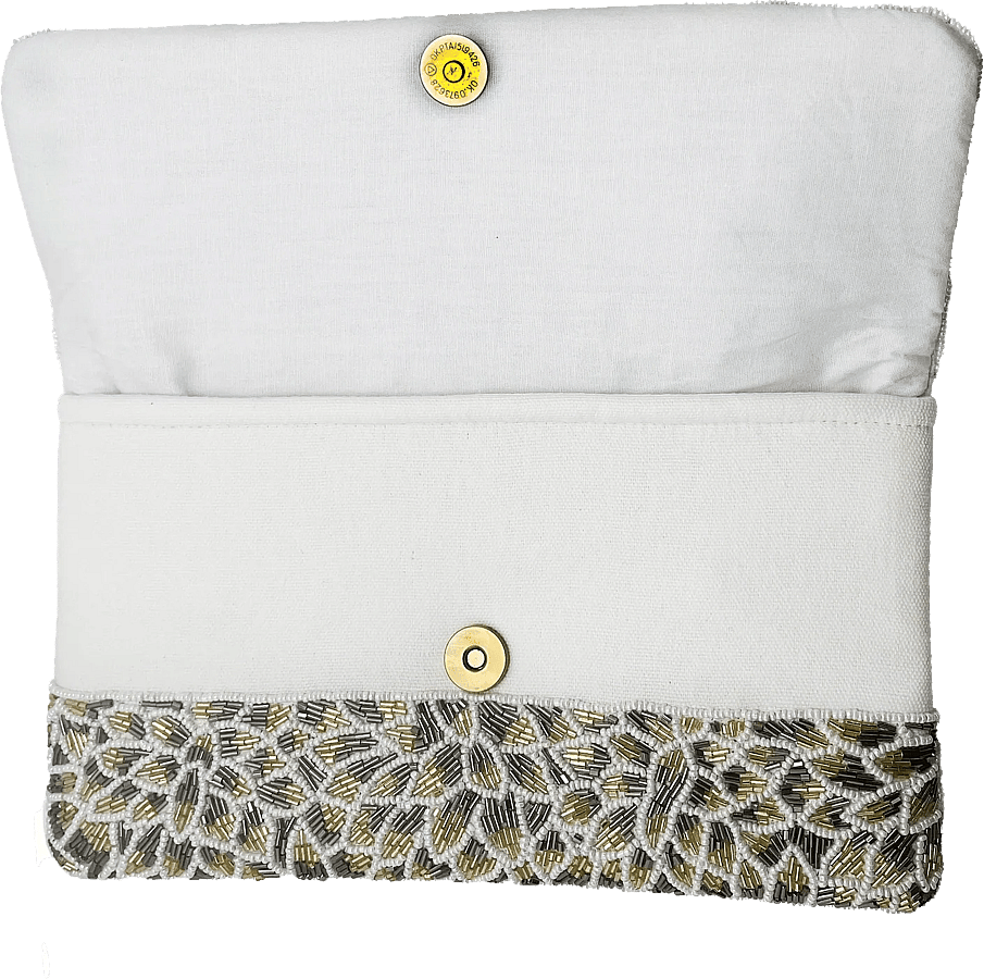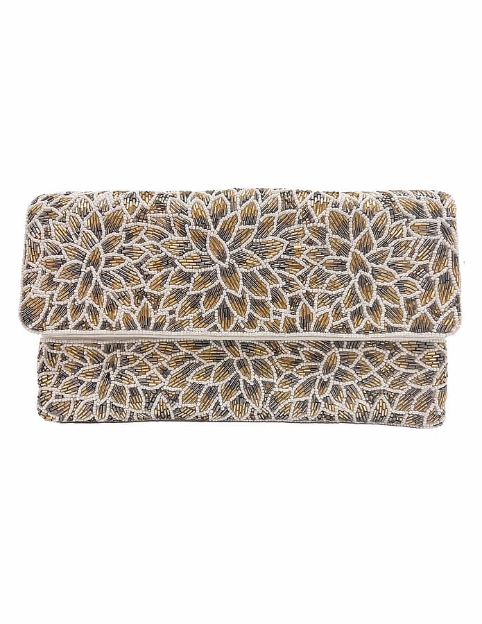 A hand-beaded evening clutch patterned with silver and gold floral motifs and a structured foldover silhouette. The Pizzaz Silver & Gold Flowers Beaded Clutch is crafted on a fabric base with intricate seed and bugle beadwork for luminous texture. Pizzazz Inc. designed this compact clutch for formal occasions and nights out when you want a statement accessory. Its slim shape slips easily into hand or under the arm for polished finishing touches.