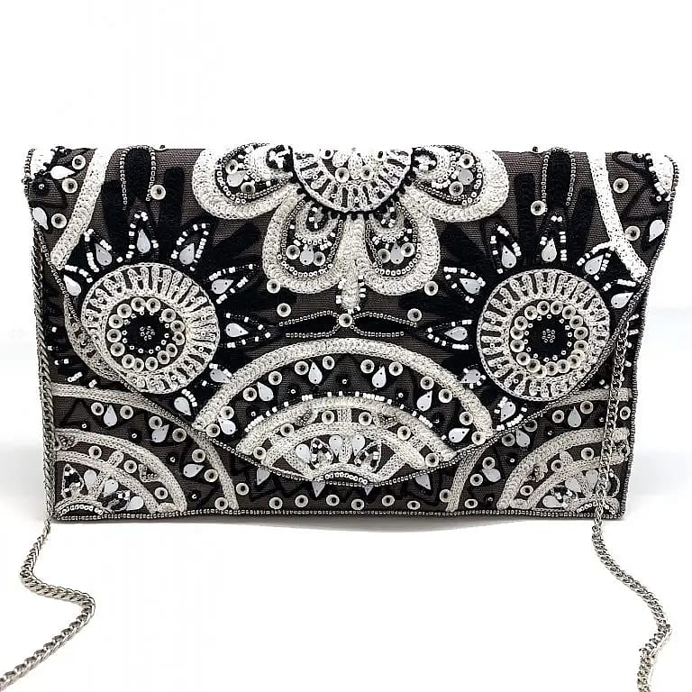 This black and white sequin and beaded floral clutch is an eye-catching evening accessory with intricate embellishment and a slim envelope silhouette. The Pizzazz design pairs layered sequin motifs and beadwork on a fine mesh fabric for high-impact texture. A delicate chain strap offers optional wear as a shoulder bag while the fold-over flap keeps essentials secure. Perfect for dressy events or a night on the town when you want a statement piece.