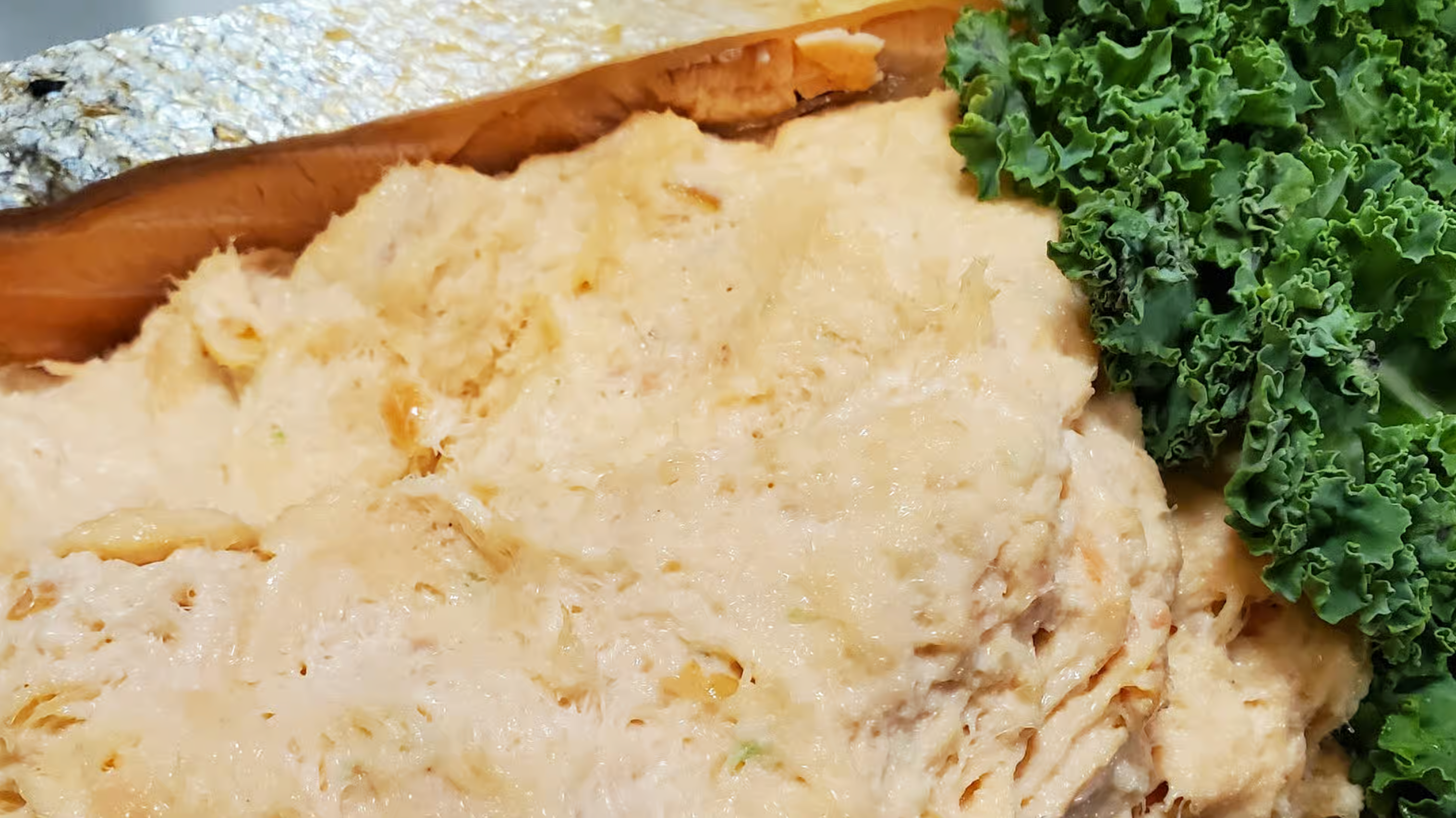 Chunks of baked salmon mixed with creamy dressing, served with fresh kale.