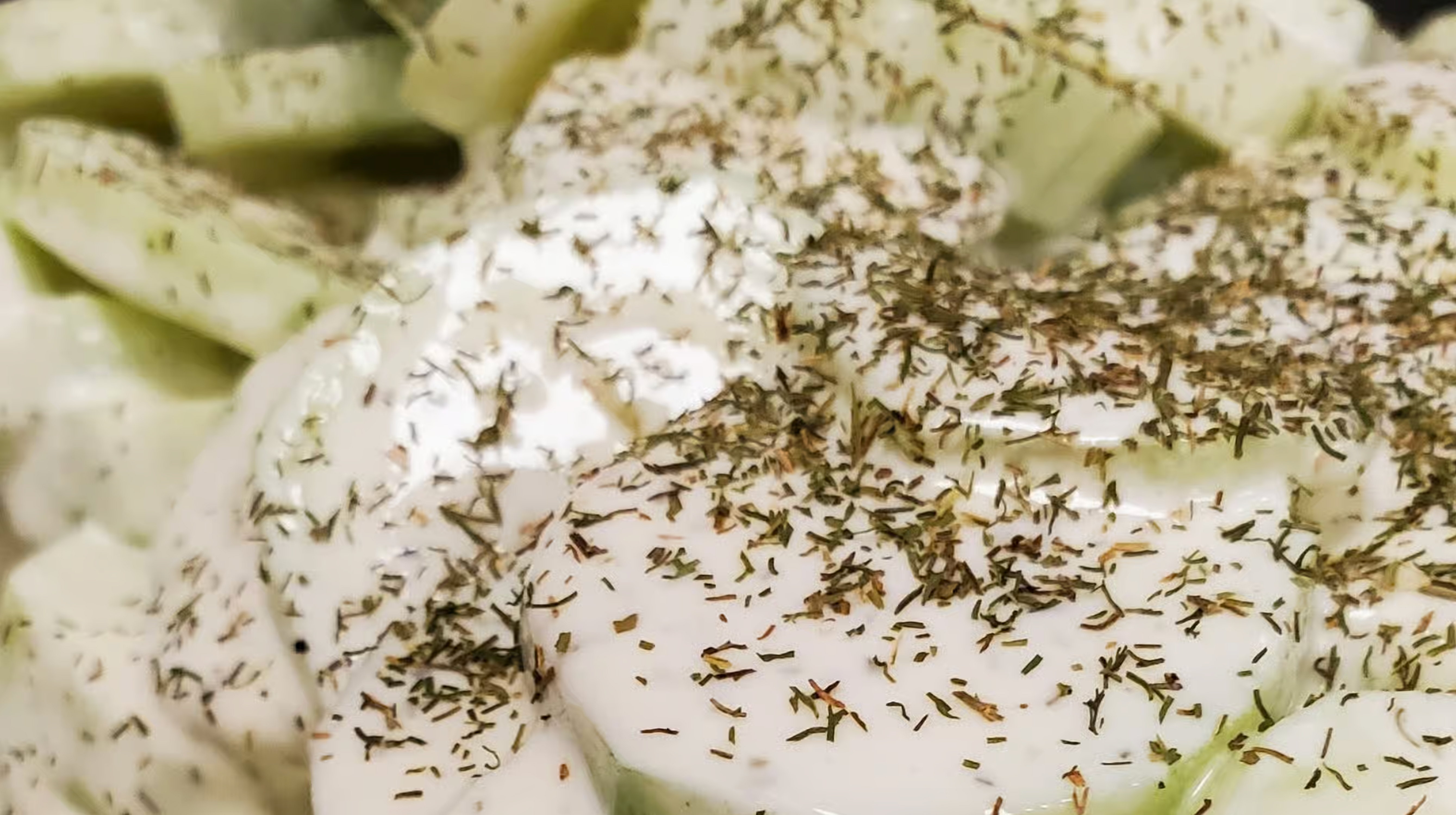 Crisp cucumber slices dressed in a creamy dill sauce.