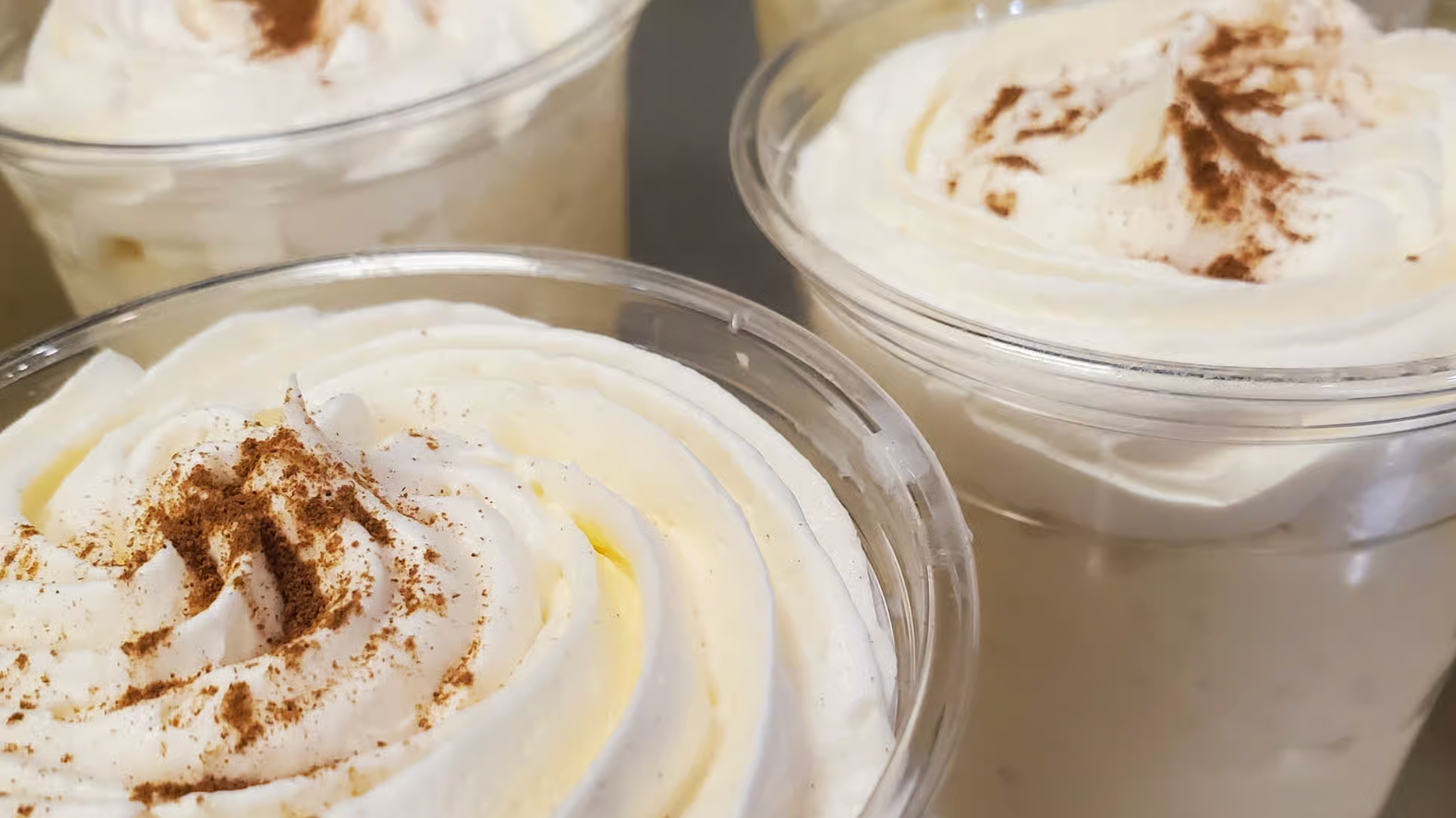 Creamy rice pudding topped with a swirl of whipped cream and a sprinkle of cinnamon.