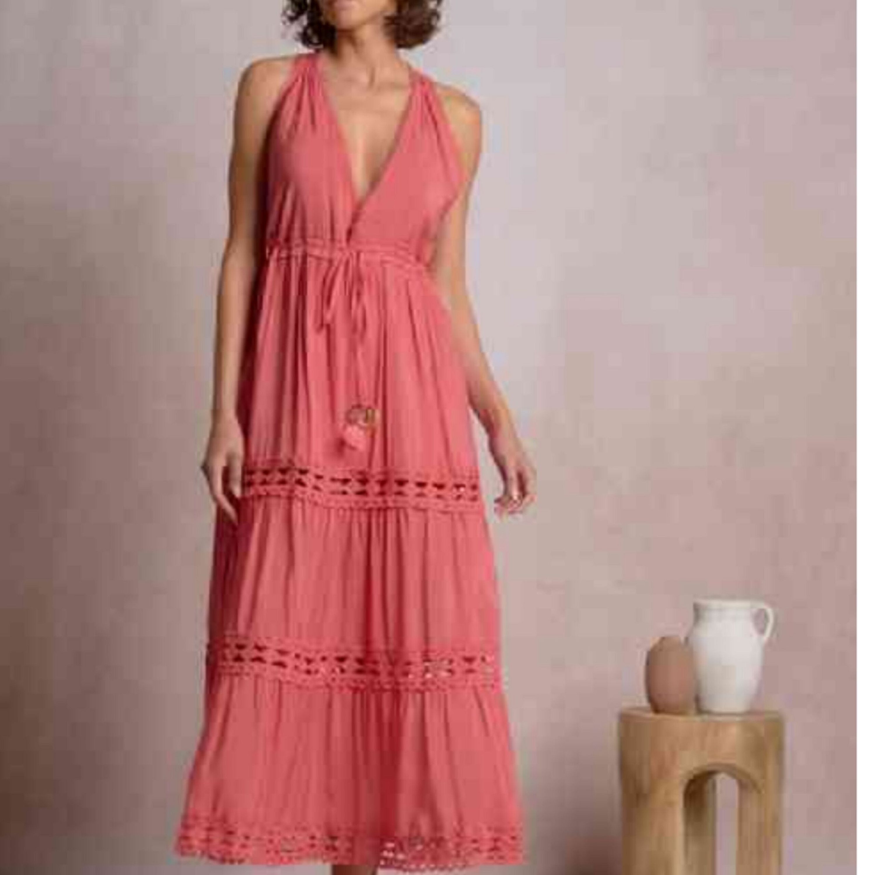 The Elan Pink Halter Maxi Dress features an elegant design with a versatile style, perfect for resort wear or casual outings. Its comfortable fit ensures effortless sophistication for any occasion.