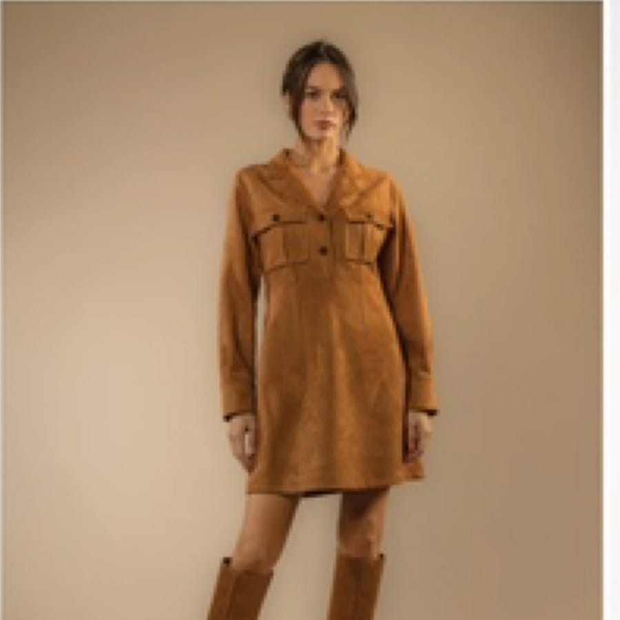 The Velvet Heart Camel Roya Dress features a luxurious soft faux suede fabric and an elegant design, perfect for versatile styling. Ideal for any occasion, it effortlessly combines comfort and sophistication.