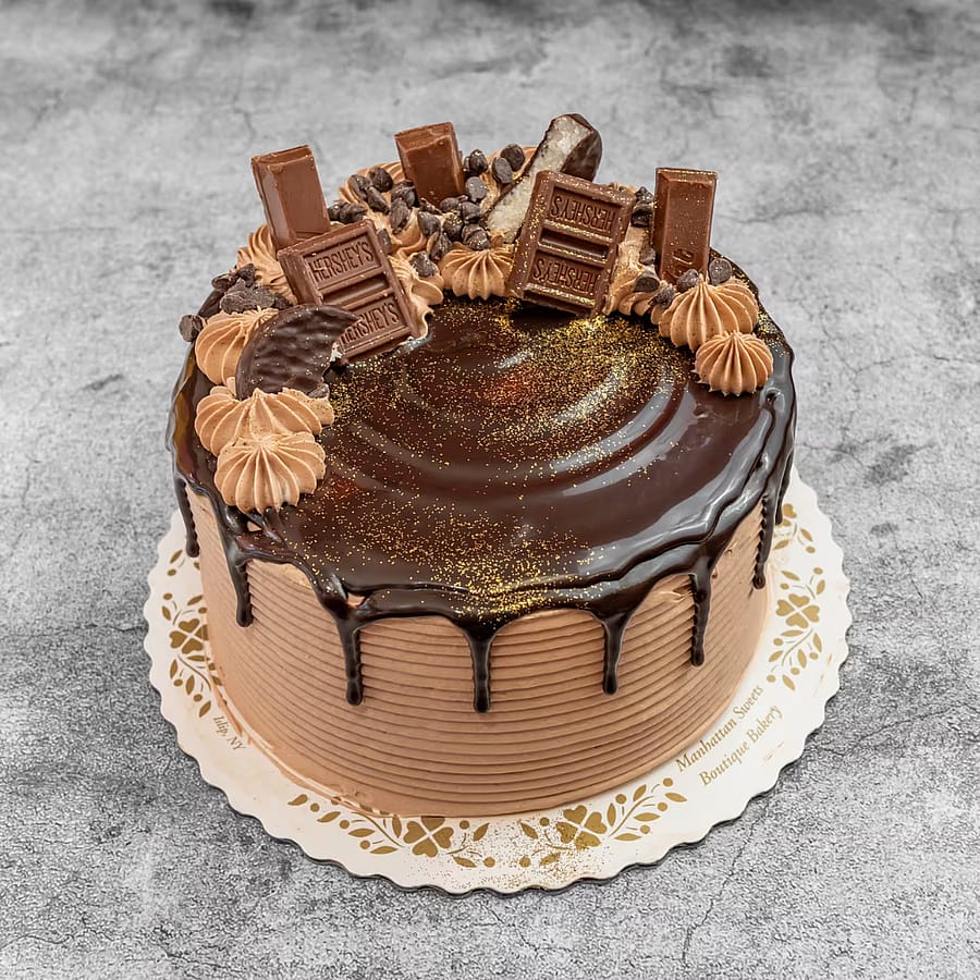A decadent chocolate layer cake topped with rich ganache drip, golden shimmer dust, mocha buttercream rosettes, and chocolate bar pieces. Perfect for any celebration that deserves a little indulgence. *Serves 6-8