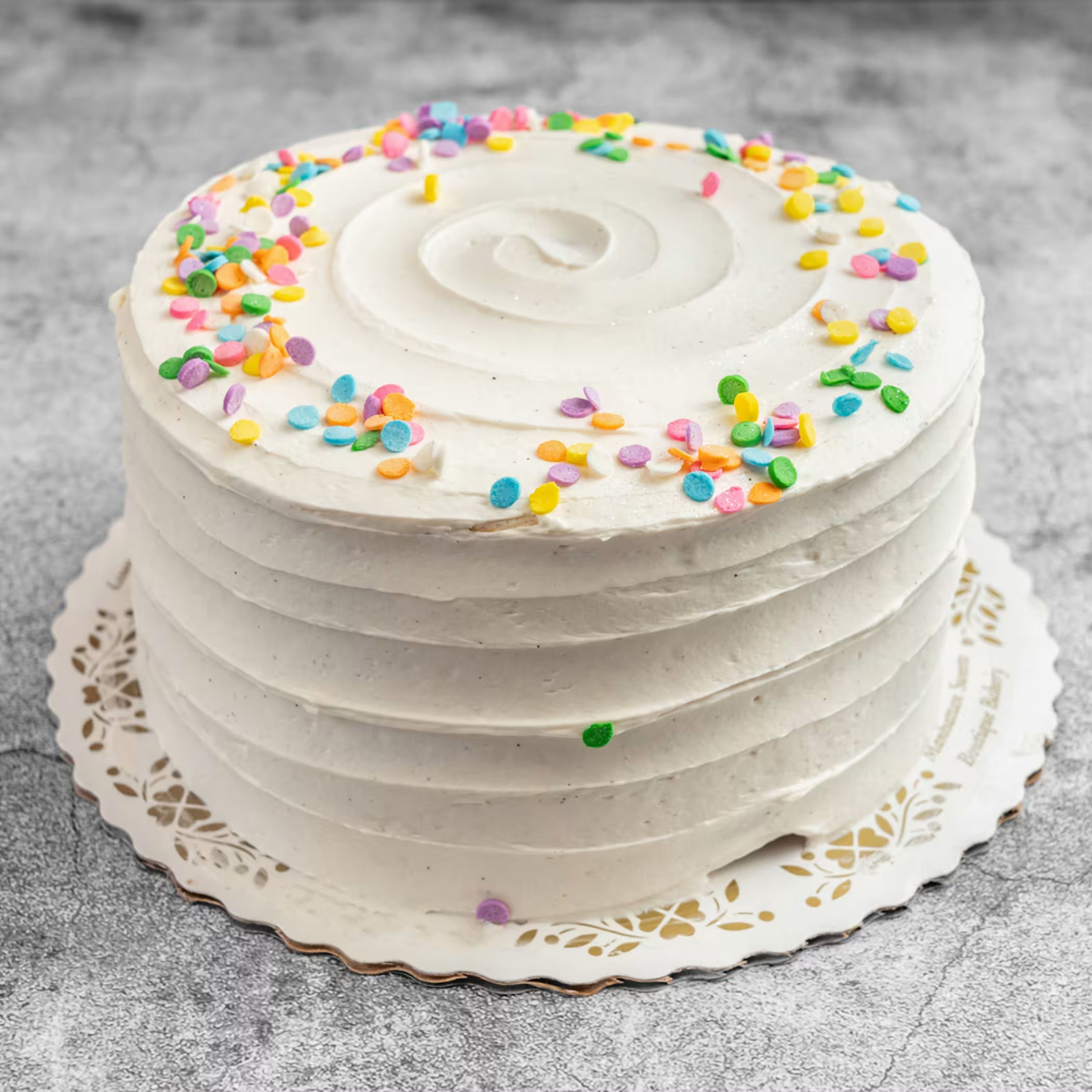 A cheerful white layer cake with fluffy vanilla buttercream, delicate ridged frosting, and a colorful confetti sprinkle topping. Light, festive, and perfect for birthdays or any fun celebration. *Serves 6-8