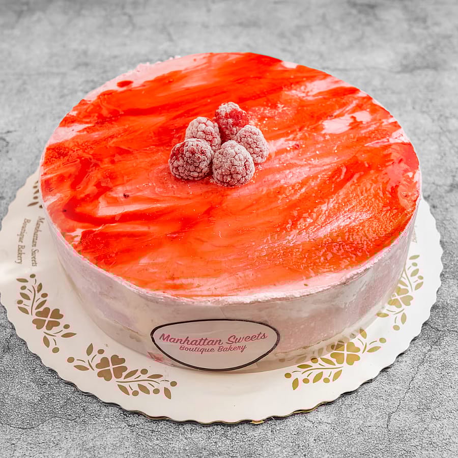 A gorgeous mousse cake with a vibrant red and coral swirled glaze, topped with delicate sugared raspberries. Light, fruity, and elegantly finished for any special occasion. *Serves 10 to 12