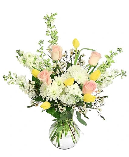 Sweetheart Vase, Seeded Eucalyptus, Myrtle, Salal, White Larkspur , White Cushion Poms, Light Pink Roses, White Stock, Yellow Tulips , White Waxflowersvau.