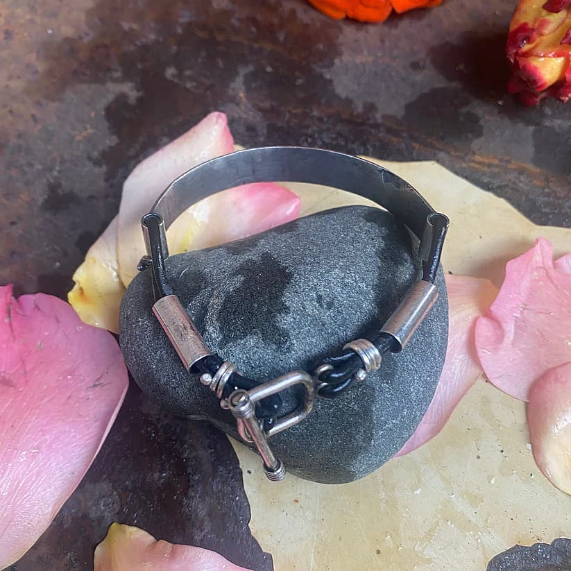 Bracelet with fine silver gallery wire and genuine leather with a little tiny Bali bead dangle .