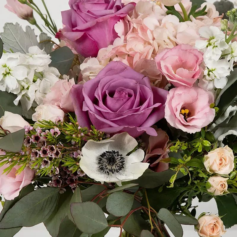 Cool off with this lovely bouquet of roses and hydrangeas.