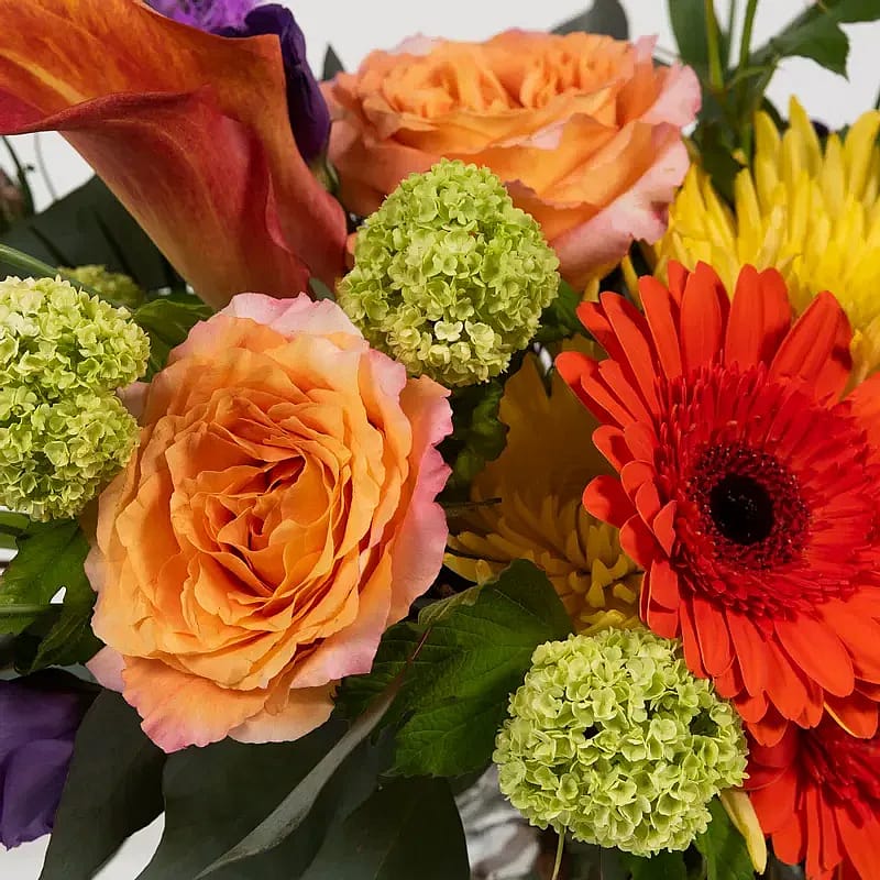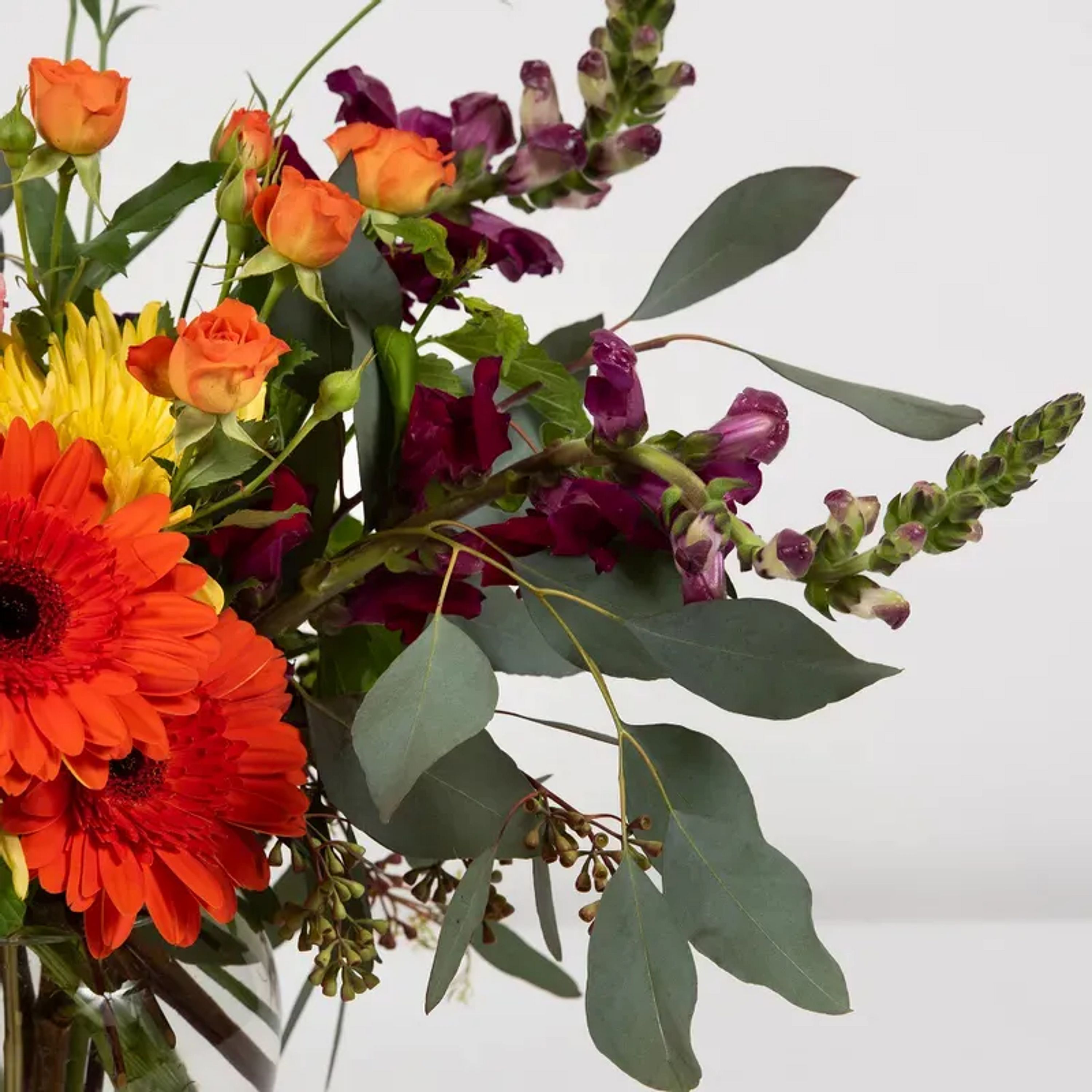 This arrangement of mini Calla lilies, snapdragons, liatris, viburnum makes for a delightful everyday arrangement.