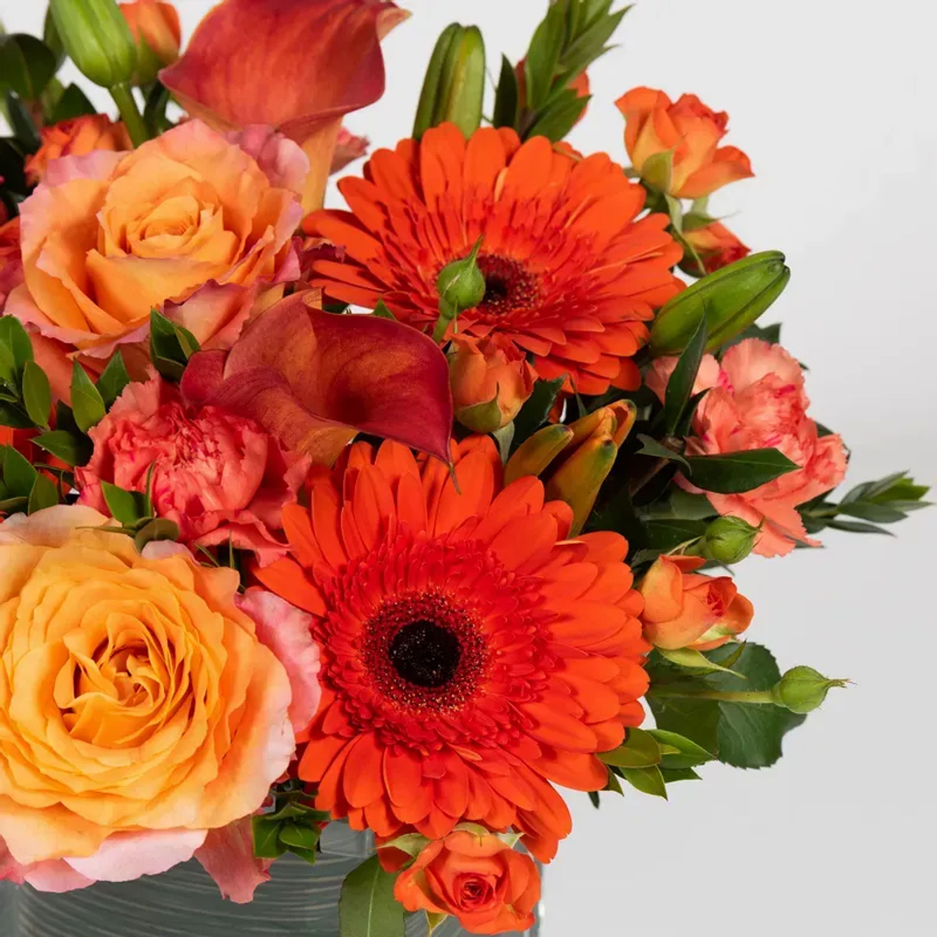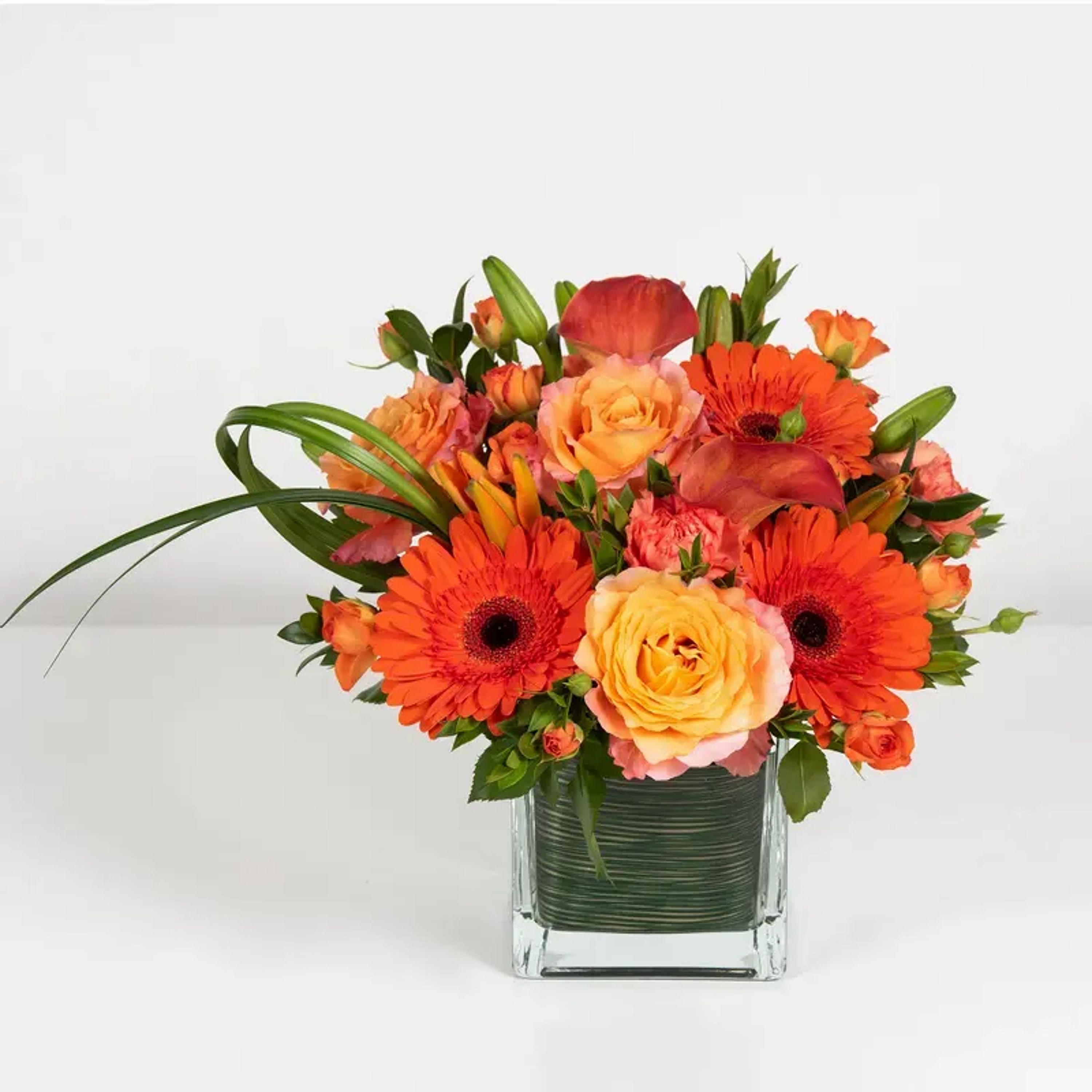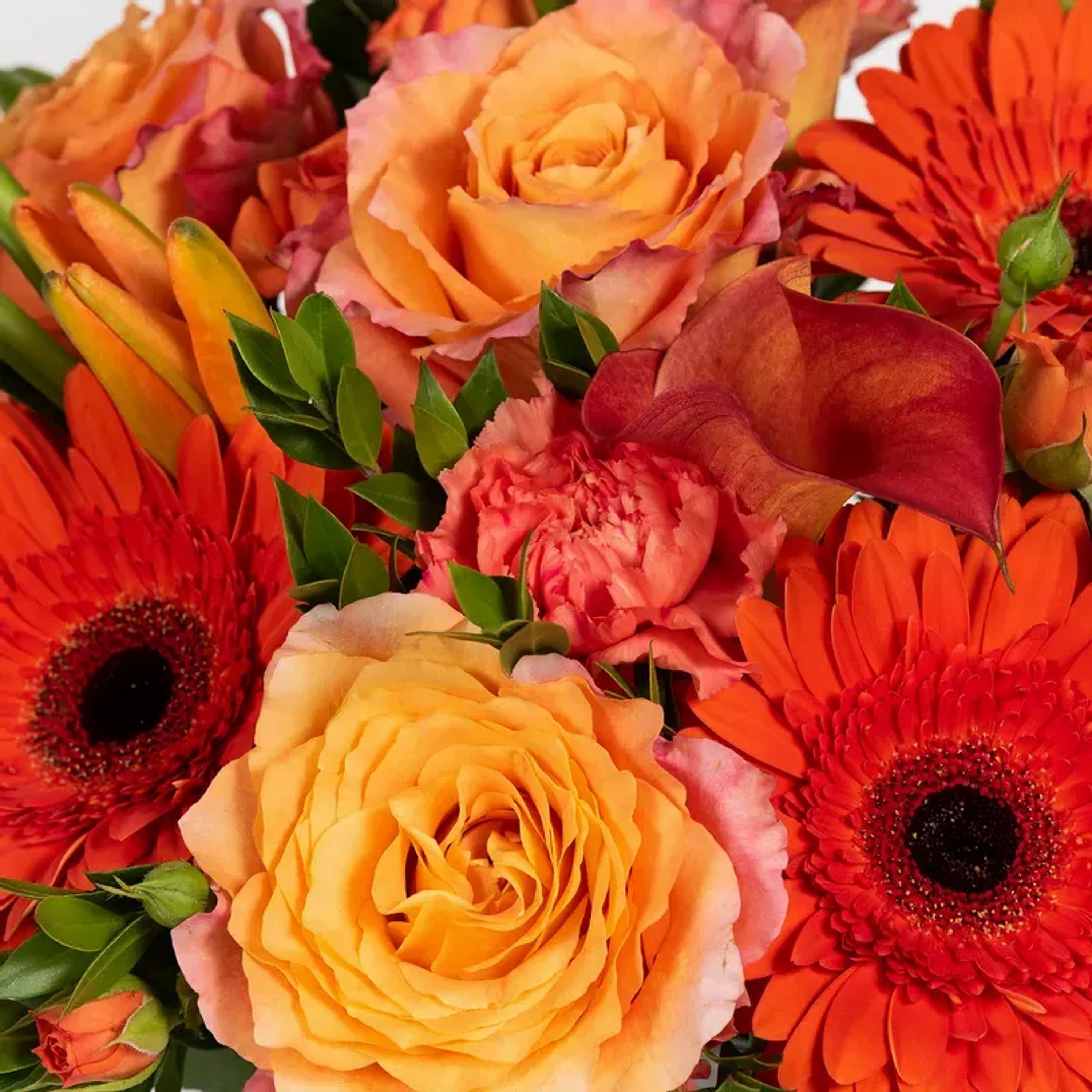 Brighten someone's day with this arrangement featuring roses, mini Calla lilies, gerbera daisies.