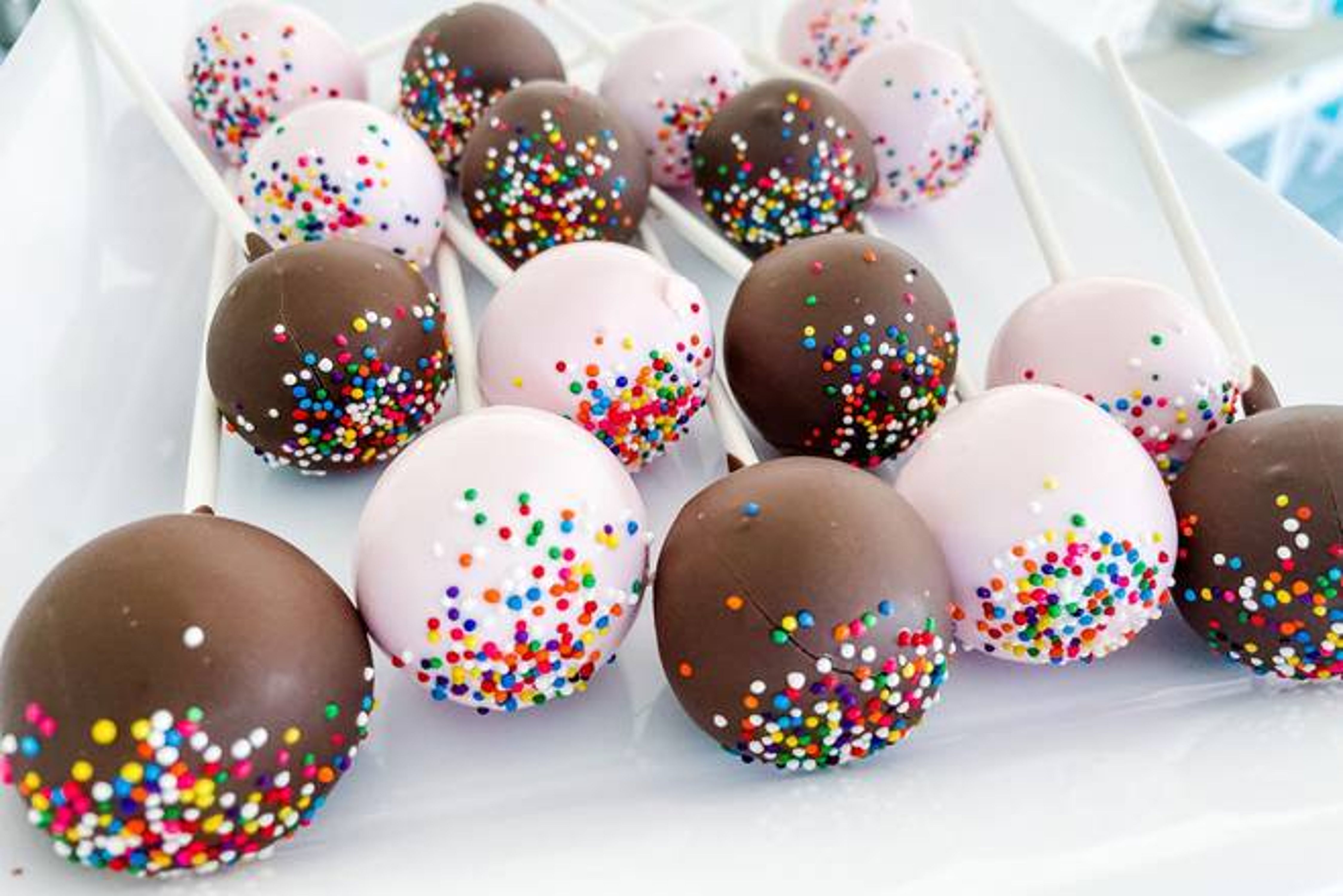 Assorted cake pops dipped in chocolate and pink candy coating, finished with rainbow sprinkles.