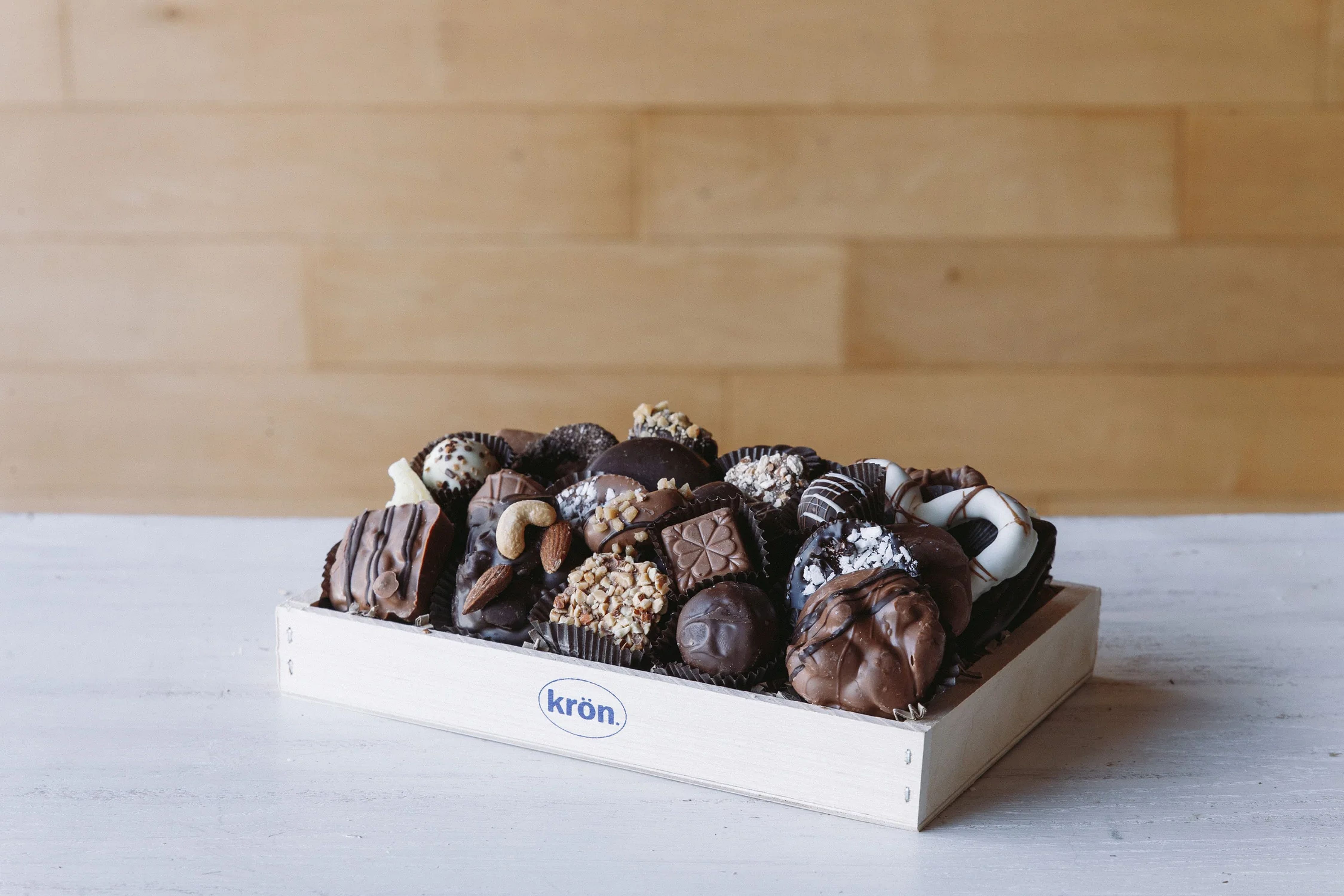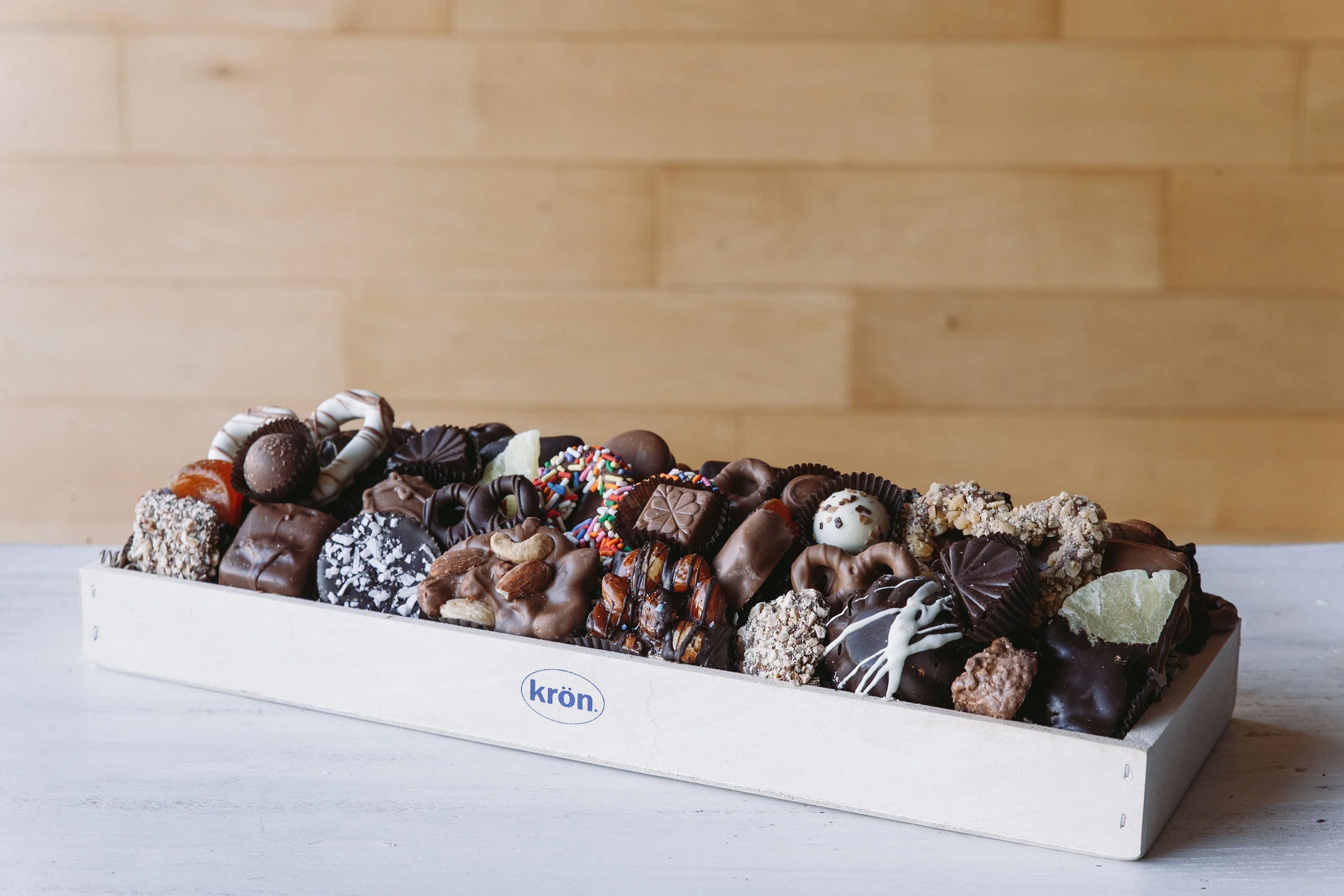 Our signature wooden crates are carefully curated to include our best-selling gourmet chocolates, made fresh daily in the Krön Chocolatier kitchen. Wooden gift crates include a selection of twice-dipped chocolate covered pretzels in a variety of toppings, caramel and nut turtles, chocolate dipped graham crackers, chocolate covered Oreos(R), marshmallows, chocolate dipped dried and glazed fruits, butter crunch, assorted chocolate truffles and more. Each distinctive gift is beautifully presented in an authentic wooden crate. Available in 5 sizes.