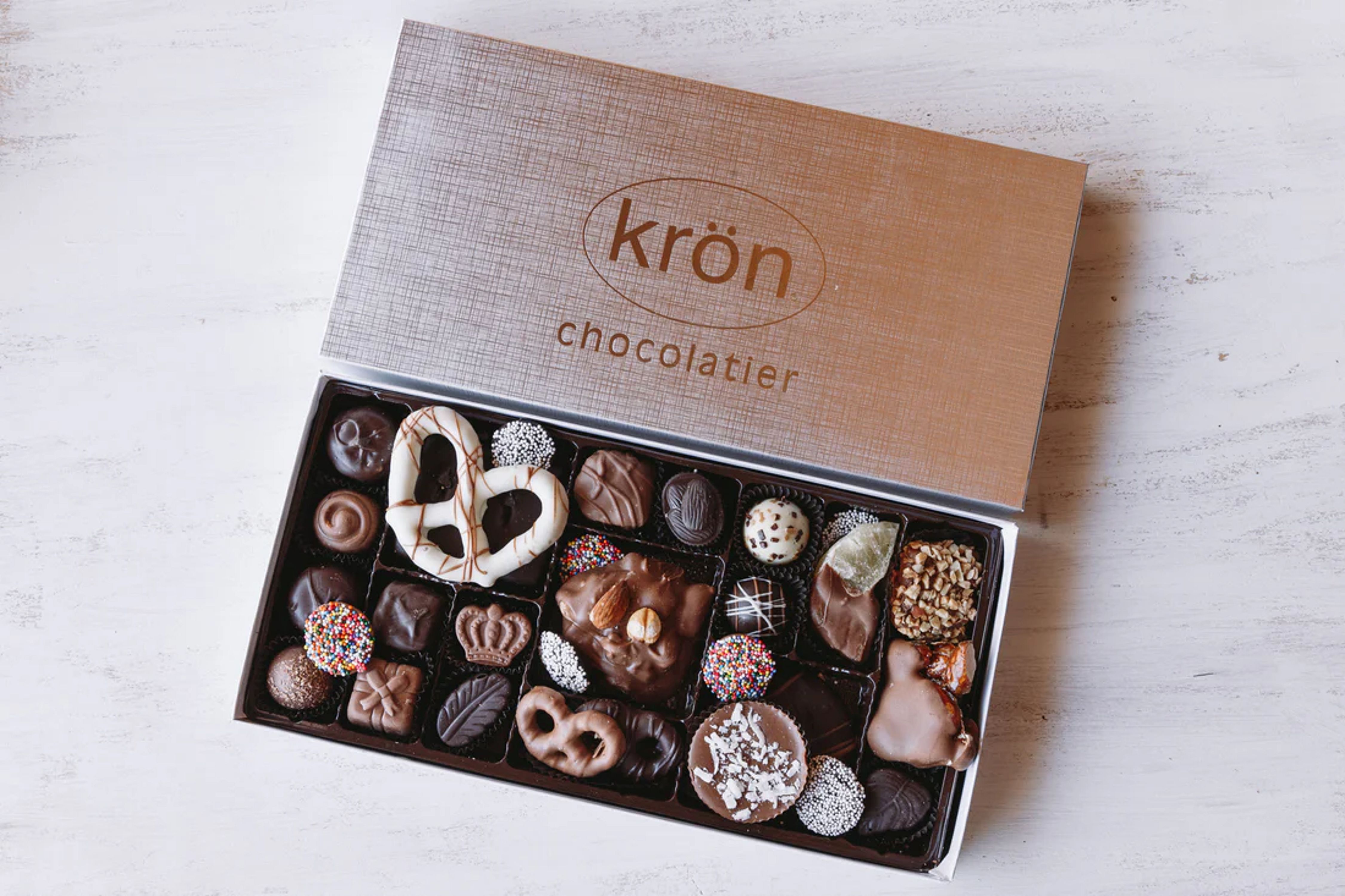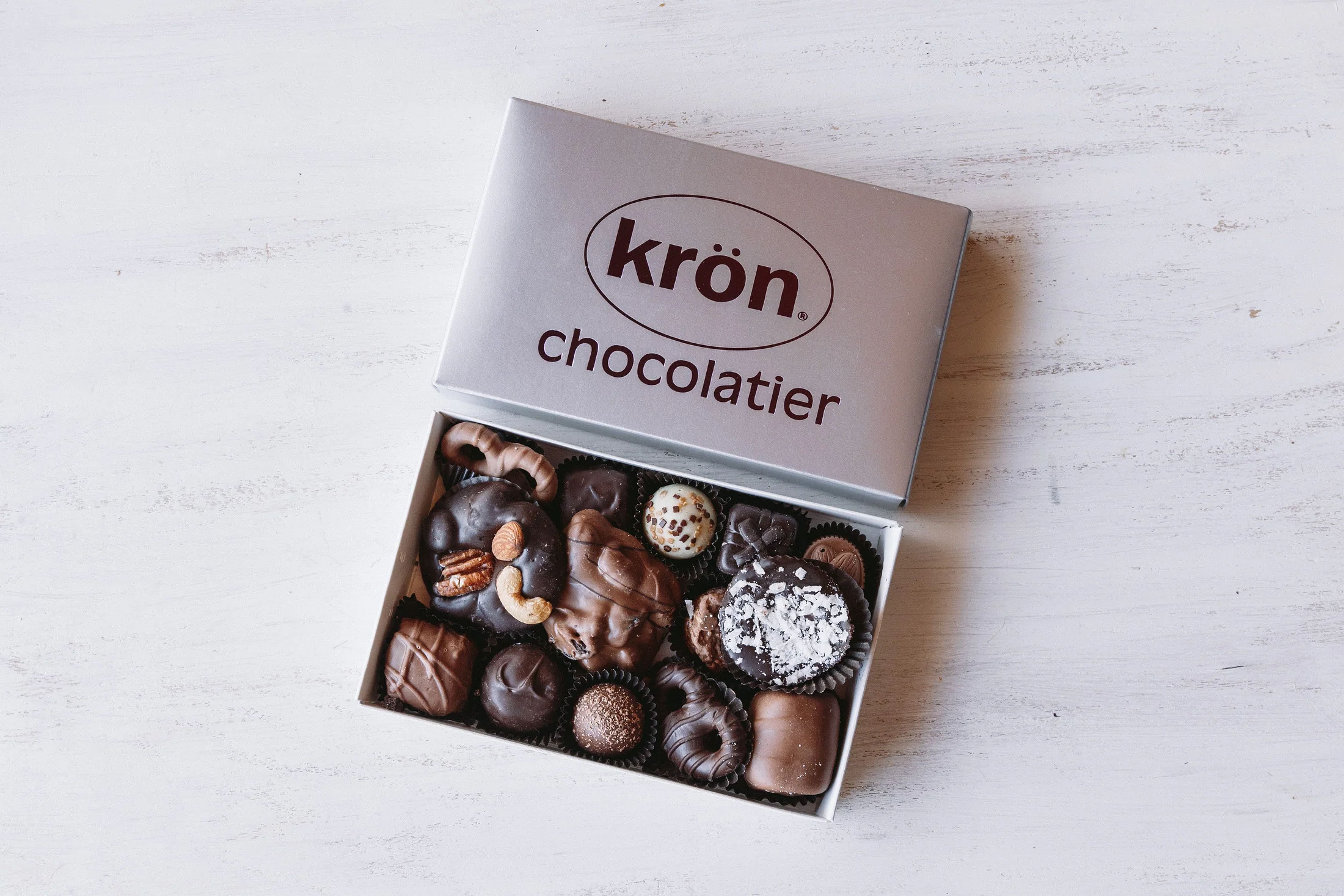 Think of it as a chocolate tasting in a box! Each piece of chocolate is one of Krön's most treasured delights. Selections may include caramel and nut turtles, almond bark, dipped caramel, twice-dipped chocolate covered pretzels, truffles, marshmallows, graham crackers, dried fruit, raisin clusters, coconut, solid milk and dark chocolates - and so much more! Each box carefully selected and shipped directly from the Krön chocolatier kitchen in Great Neck, NY. We also make this available in dairy-free Parve version.