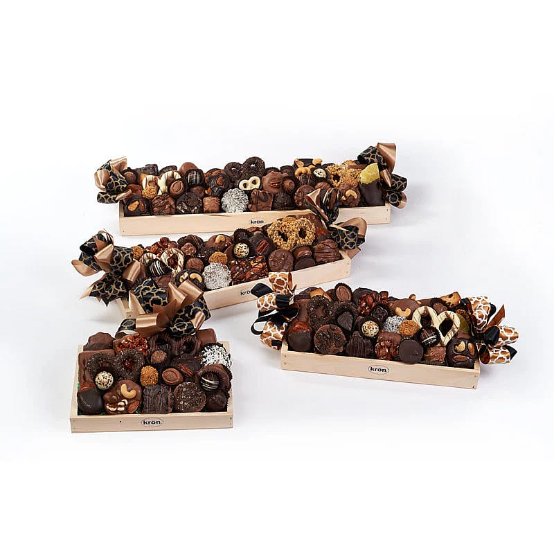 Our signature wooden crates are carefully curated to include our best-selling gourmet chocolates, made fresh daily in the Krön Chocolatier kitchen. Wooden gift crates include a selection of our hand made non -dairy chocolates, including: twice-dipped chocolate covered pretzels in a variety of toppings, chocolate dipped graham crackers, chocolate covered sandwich cookies, vegan marshmallows, chocolate dipped dried and glazed fruits, nut clusters, raisin clusters, coconut cups, almond bark and more. Each distinctive gift is beautifully presented in an authentic wooden crate. Available in 5 sizes.
